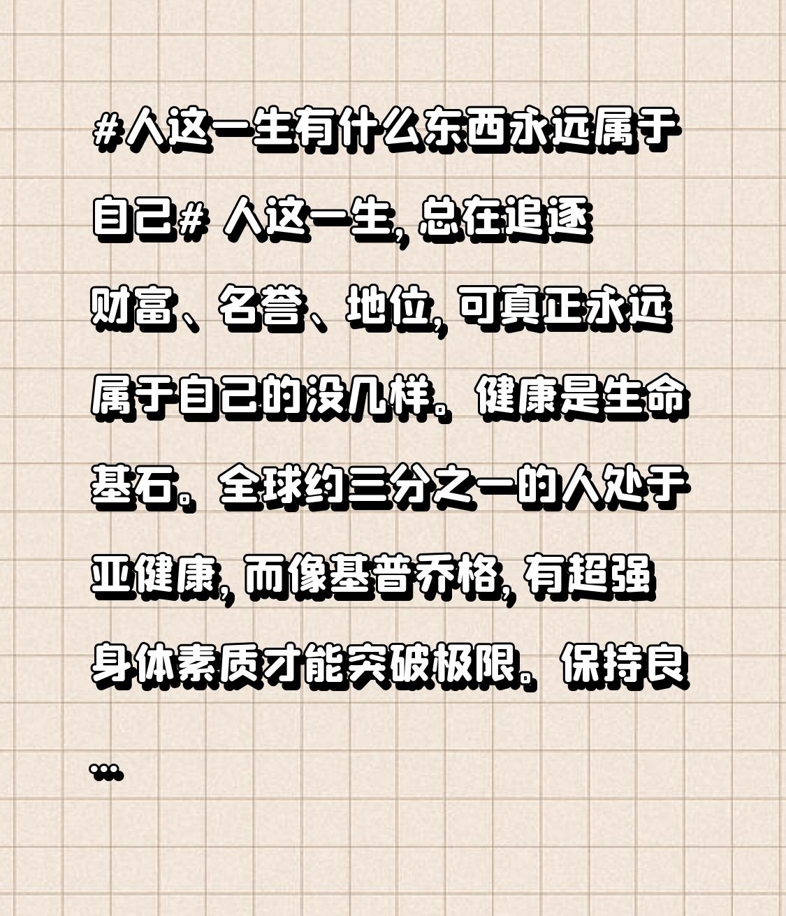 健康是生命基石。全球约三分之一的人处于亚健康,而像基普乔格,有超强身体素质才能突破极限。保持良好习惯,健康就永远相伴。