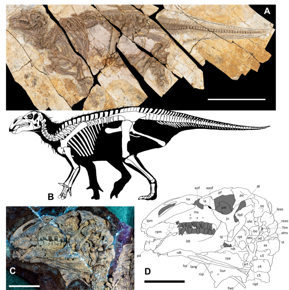据介绍,属名“豪龙”(Haolong)取自其体表密集的尖刺状皮肤结构,种名“董氏”(dongi)则纪念已故中国恐龙研究奠基人董枝明先生。该化石为一具幼年个体骨架,产自1.25亿年前的热河生物群,现收藏于安徽省地质博物馆。尽管全长仅2.45米且处于生长期,其骨骼与皮肤组织保存近乎完整。支序分析显示,董氏豪龙为禽龙类鸭嘴龙超科(Hadrosauroidea)的基干类群,且比同样产自辽西热河生物群相同层位的锦州龙和薄氏龙更为原始。