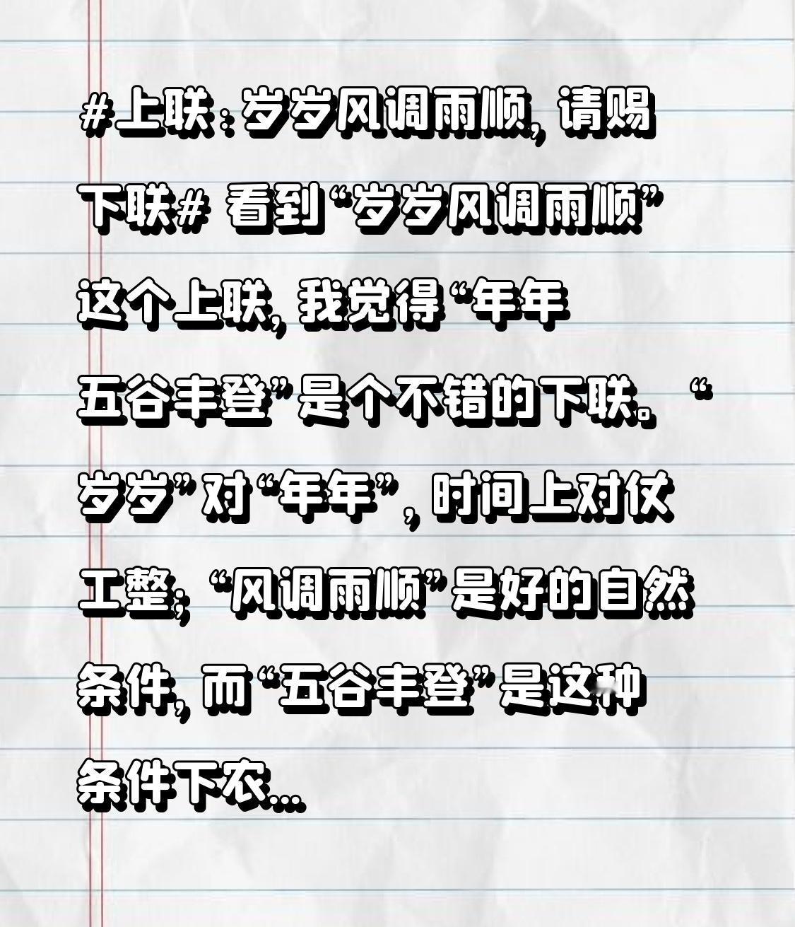 岁岁风调雨顺,请赐下联 看到“岁岁风调雨顺”这个上联,我觉得“年年五谷丰登”是个不错的下联。“岁岁”对“年年”,时间上对仗工整;“风调雨顺”是好的自然条件,而“五谷丰登”是这种条件下农业丰收的景象,因果关系明确,表达了对丰收的期盼。