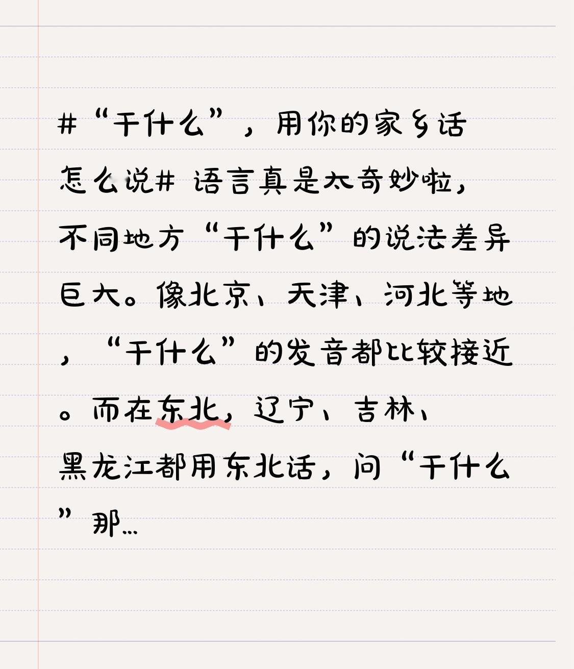 语言真是太奇妙啦,不同地方“干什么”的说法差异巨大。像北京、天津、河北等地,“干什么”的发音都比较接近。而在东北,辽宁、吉林、黑龙江都用东北话,问“干什么”那味儿老足了。