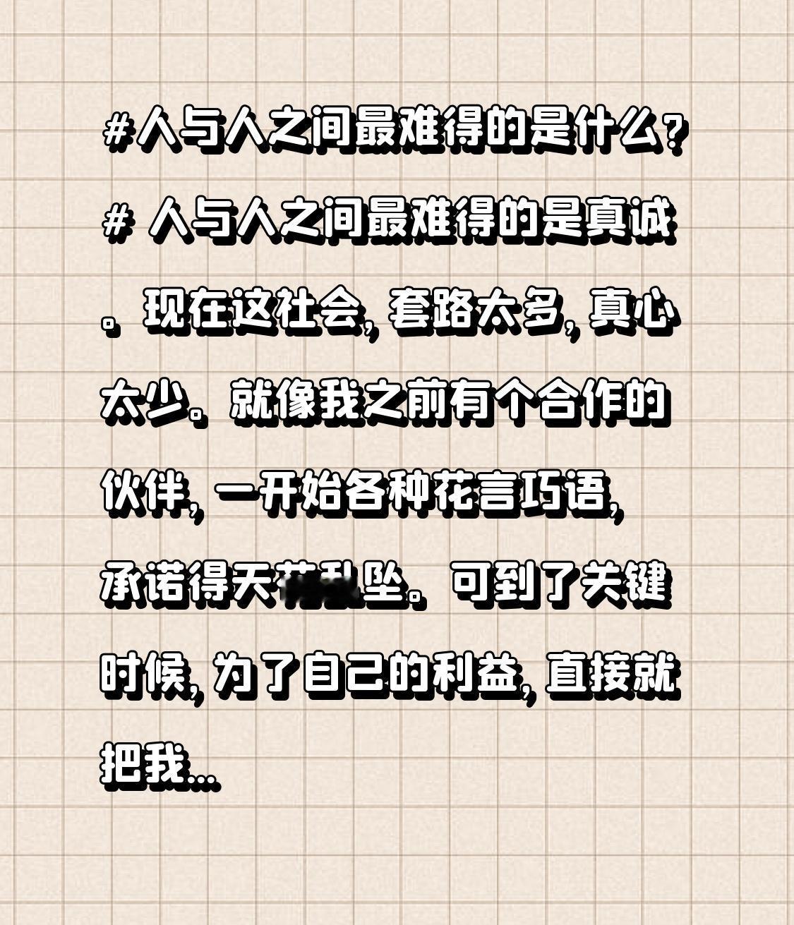 人与人之间最难得的是什么? 人与人之间最难得的是真诚。现在这社会,套路太多,真心太少。就像我之前有个合作的伙伴,一开始各种花言巧语,承诺得天花乱坠。可到了关键时候,为了自己的利益,直接就把我给坑了。