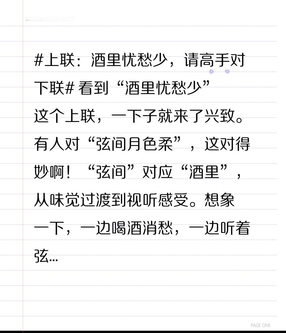 看到“酒里忧愁少”这个上联,一下子就来了兴致。有人对“弦间月色柔”,这对得妙啊!“弦间”对应“酒里”,从味觉过渡到视听感受。想象一下,一边喝酒消愁,一边听着弦乐,月光轻柔洒落,多有意境。还有人对“诗中浪漫多”,也很不错。酒能让人暂时忘却忧愁,诗则能带来浪漫的遐想。我觉得对联就是一种文字游戏,能把不同的意象巧妙组合,展现出别样的韵味。大家不妨也开动脑筋,说不定能对出更精彩的下联呢。