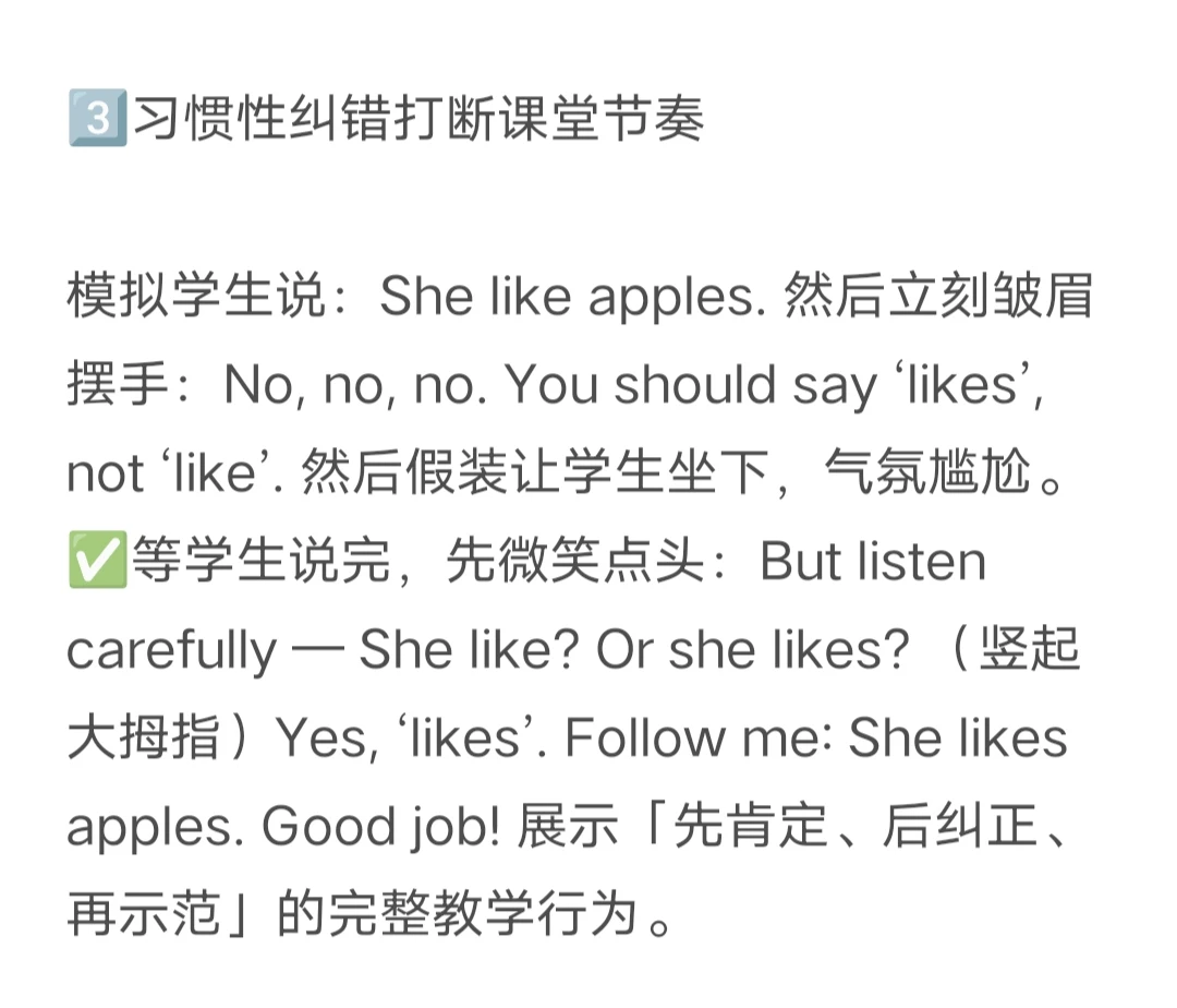 ✅等学生说完,先微笑点头:But listen carefully — She like? Or she likes? (竖起大拇指)Yes, ‘likes’. Follow me: She likes apples. Good job! 展示「先肯定、后纠正、再示范」的完整教学行为。