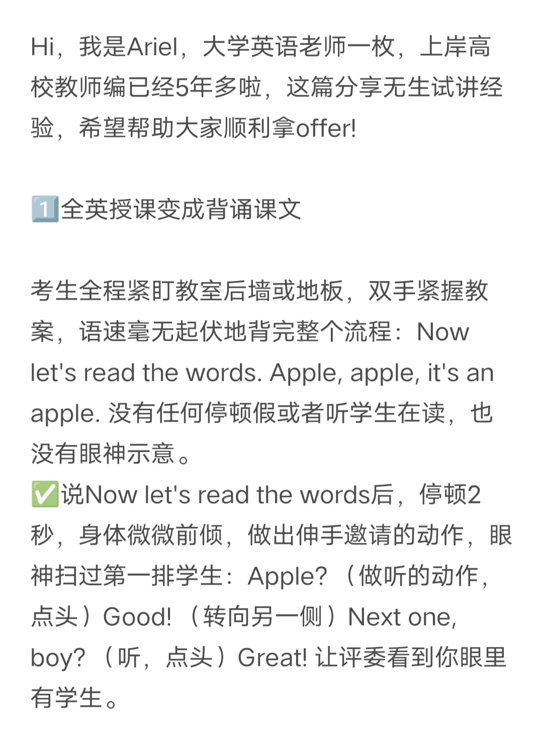 考生全程紧盯教室后墙或地板,双手紧握教案,语速毫无起伏地背完整个流程:Now let's read the words. Apple, apple, it's an apple. 没有停顿假或者听学生在读,也没有示意。