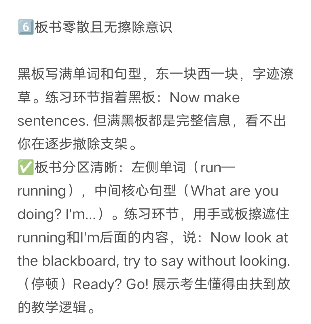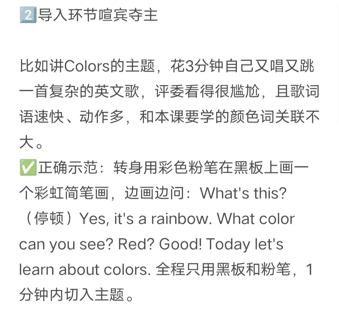 ✅正确示范:转身用彩色粉笔在黑板上画一个彩虹简笔画,边画边问:What's this? (停顿)Yes, it's a rainbow. What color can you see? Red? Good! Today let's learn about colors. 全程只用黑板和粉笔,1分钟内切入主题。
