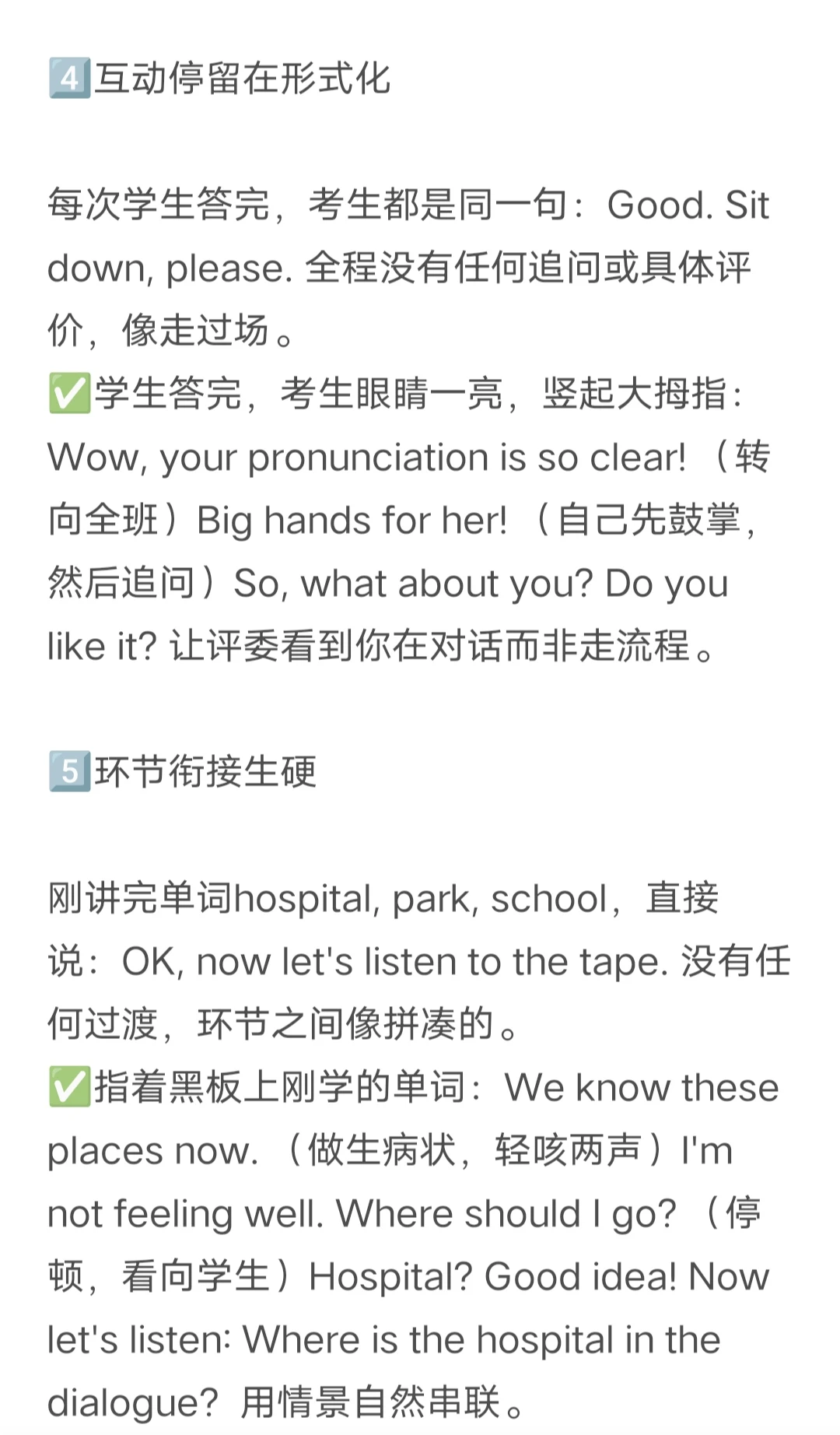 ✅学生答完,考生眼睛一亮,竖起大拇指:Wow, your pronunciation is so clear! (转向全班)Big hands for her! (自己先鼓掌,然后追问)So, what about you? Do you like it? 让评委看到你在对话而非走流程。