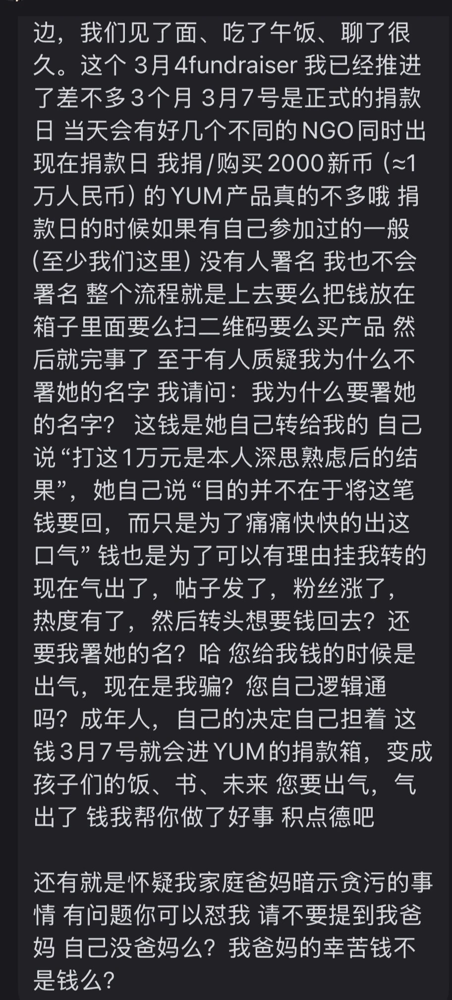 本人作为一个完全民事行为能力人,打出这1万元是本人深思熟虑后的结果,同时因在梳理时间线时推断对方民事行为能力有限,所以深知这1万元要回来的可能性有多少。本人的目的并不在于将这笔钱要回,而只是为了痛痛快快的出这口气。