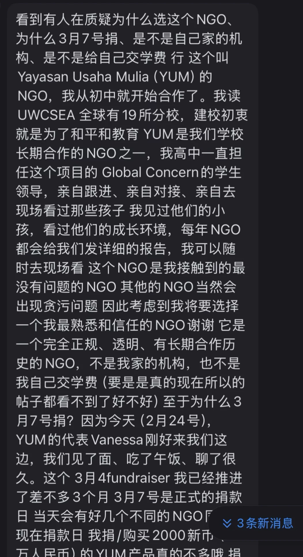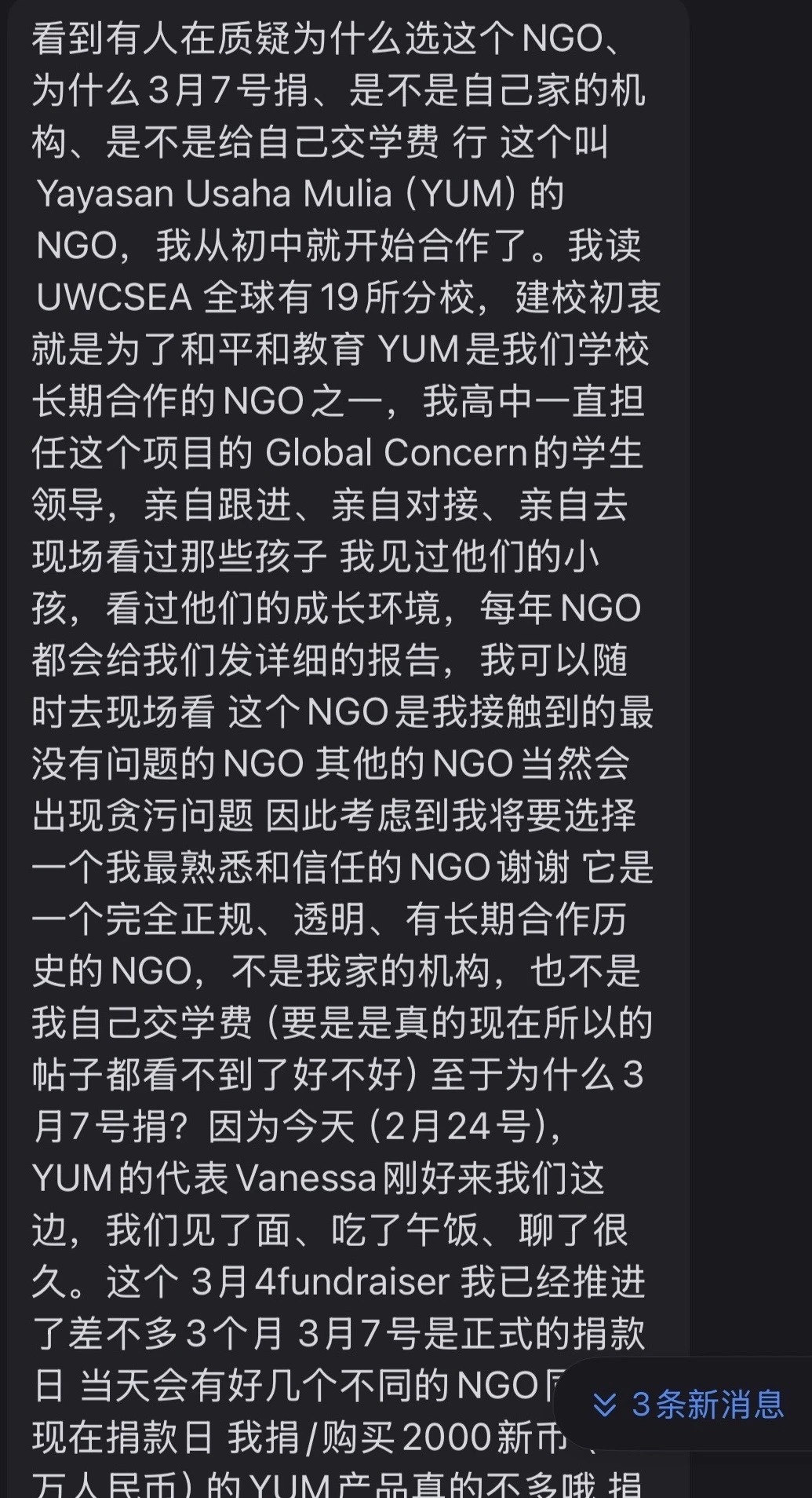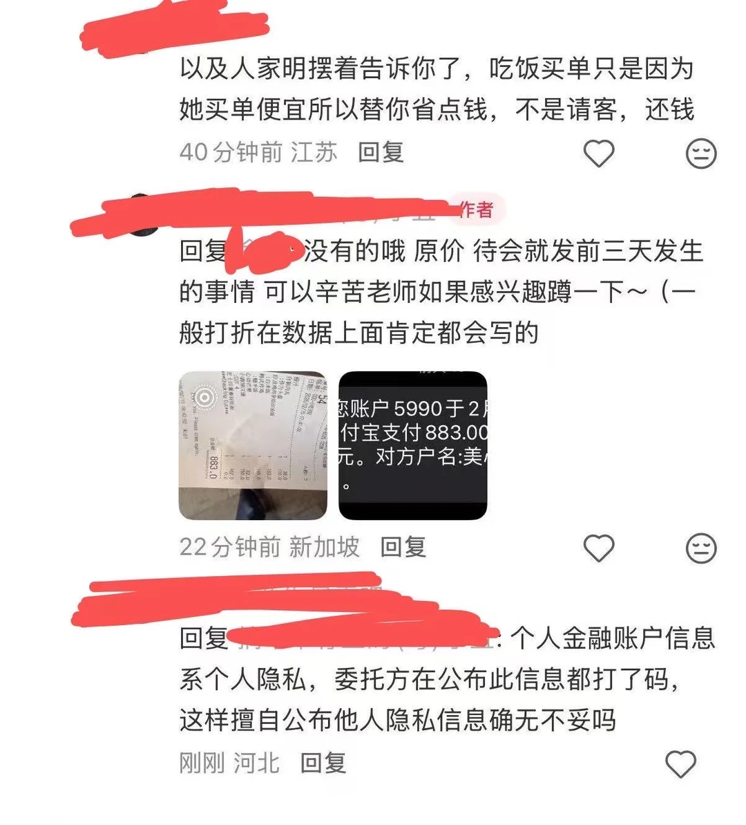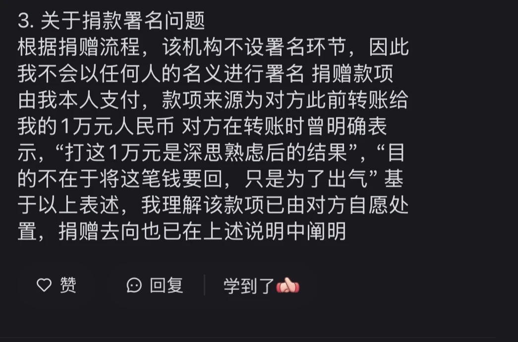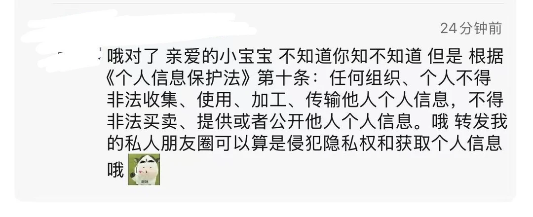 另外,其在朋友圈指控本人及本人朋友存在侵犯其隐私权及获取其个人信息行为的言论,均为无稽之谈‘。本人在将事件原委发布到社交平台时,已提前告知对方且获得了对方同意,发布时也已遵守承诺进行了有效打码。在本人发布后到其在同社交平台上承认其行为前,无人知晓事件主人公身份。