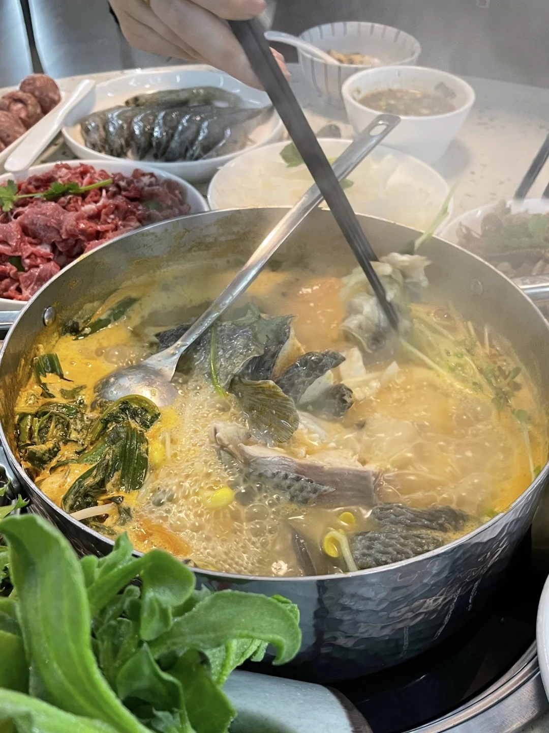 贵州旅游回来对酸汤真的心心念念!酸汤牛肉吃过了!这次找了这家的酸汤鱼!开锅先来一一碗酸汤!真的非常地道!酸酸辣辣很开胃!鱼完全不腥诶!配他们家的秘制蘸酱很不错!
