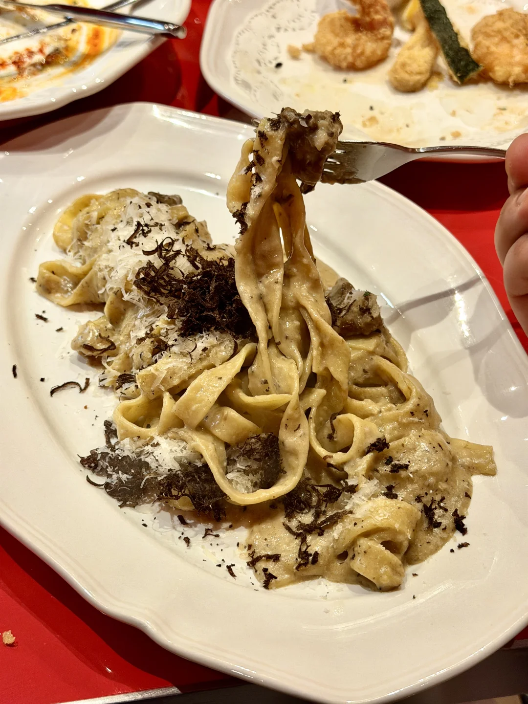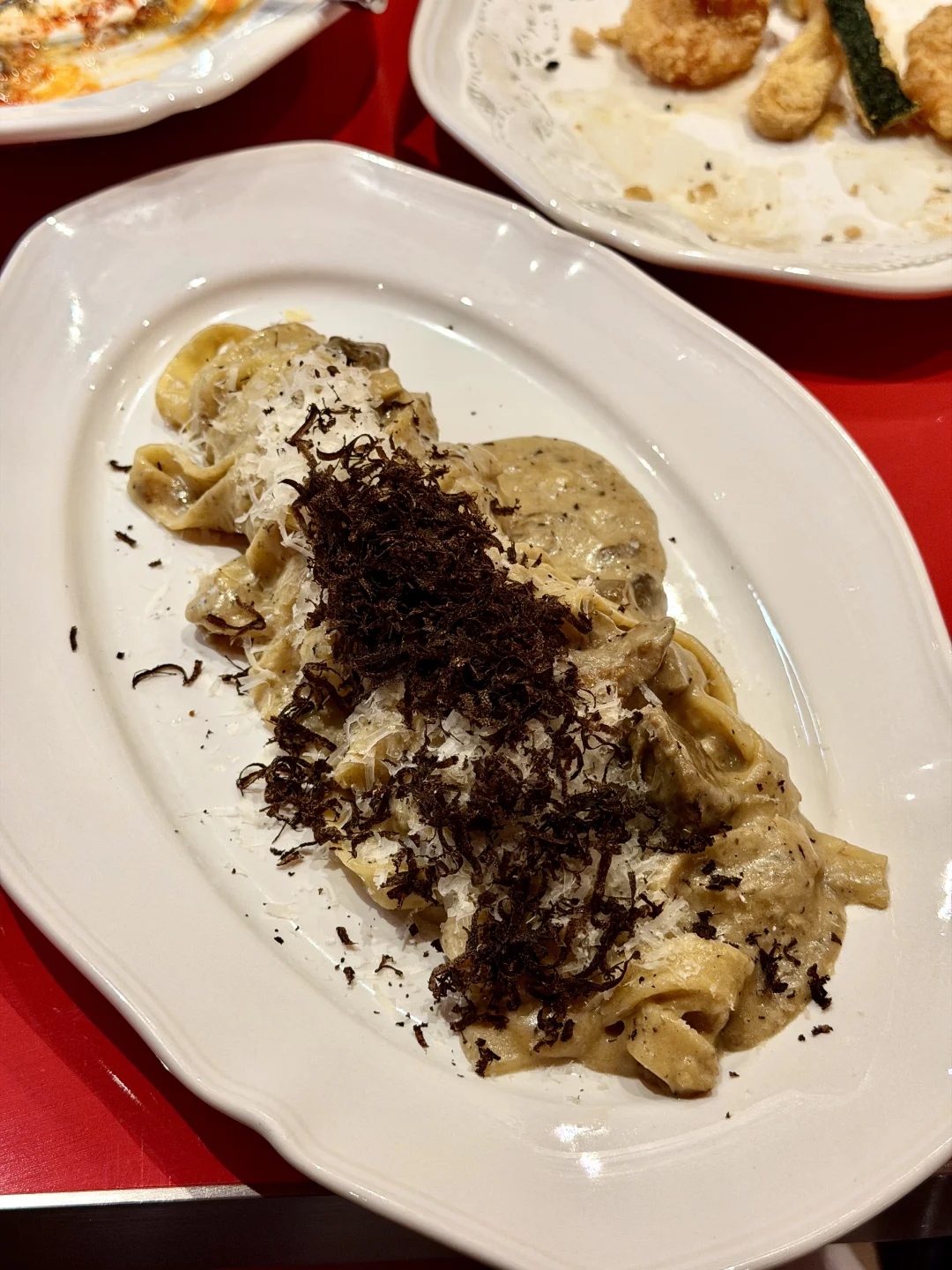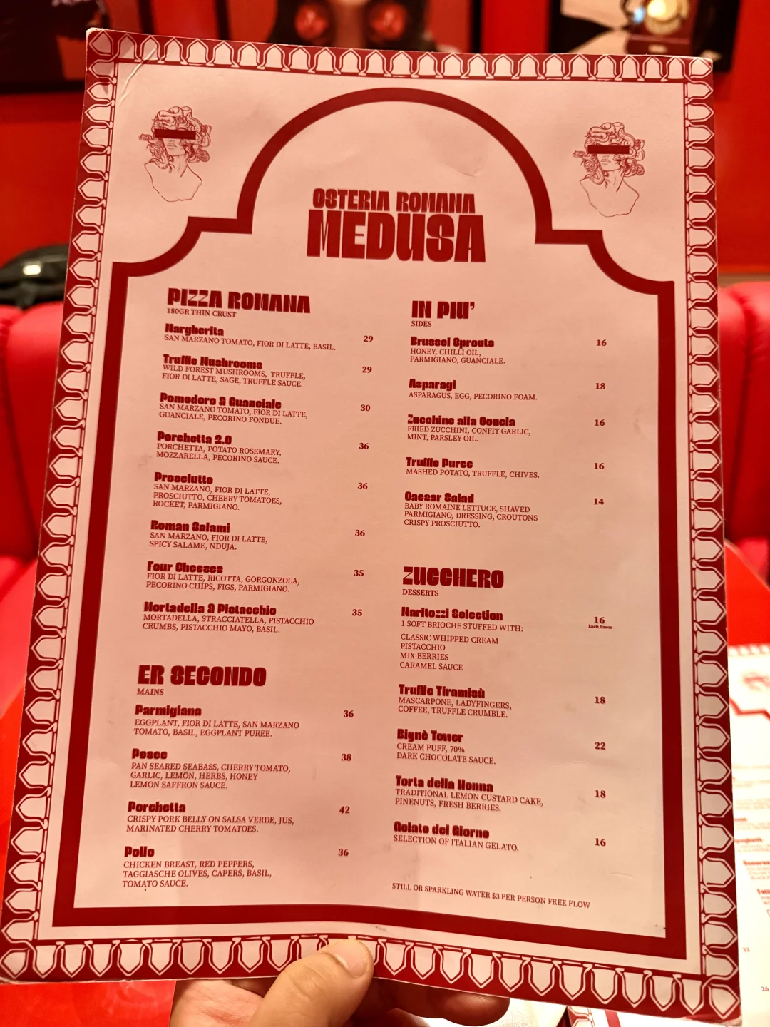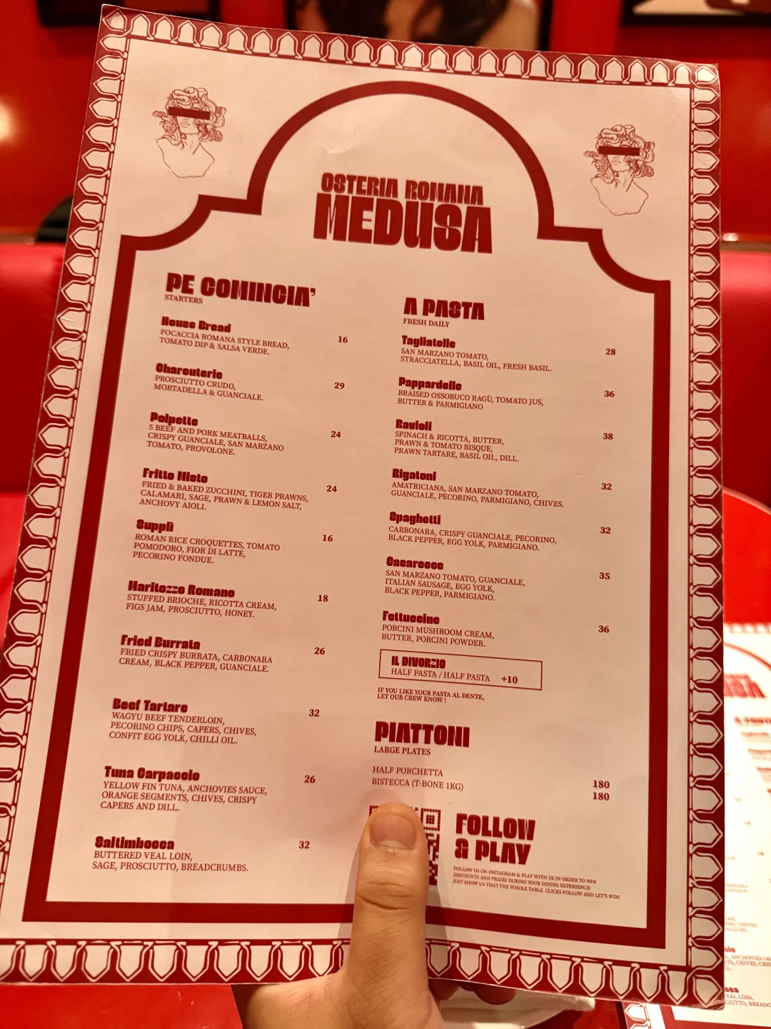 这家在新加坡JW Marriott楼下的意大利菜真的不错,尤其提拉米苏最考验水平,超大分量的提拉米苏最后舔盘了(提拉米苏放了松露丝,有点特别)。 炸鱿鱼和虾还有青瓜的那盘,非常咸香酥脆甚至烫嘴,就得趁热吃。意面我推荐这份黑松露的宽面更有嚼劲也很香浓,另一份细的不如我这个好吃。还有炸布拉塔芝士球,搭配他们的辣椒油吃特别香。他们辣椒油一点都不辣,就是纯香! 一桌子吃的120多新,真的值。因为菜都扛打,没有💣~ 💰指数:人均60新++ 评分:⭐️⭐️⭐️⭐️ 体验:⭐️⭐️⭐️⭐️⭐️ 📍: Medusa Italian Osteria Romana 26 Beach Rd, B1-22 South Beach Avenue, Singapore 189768
