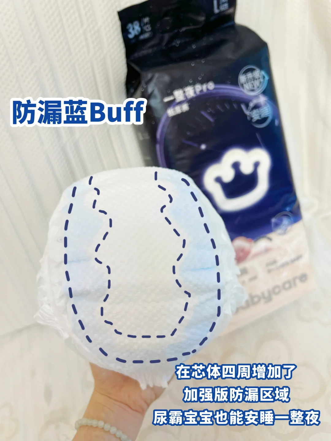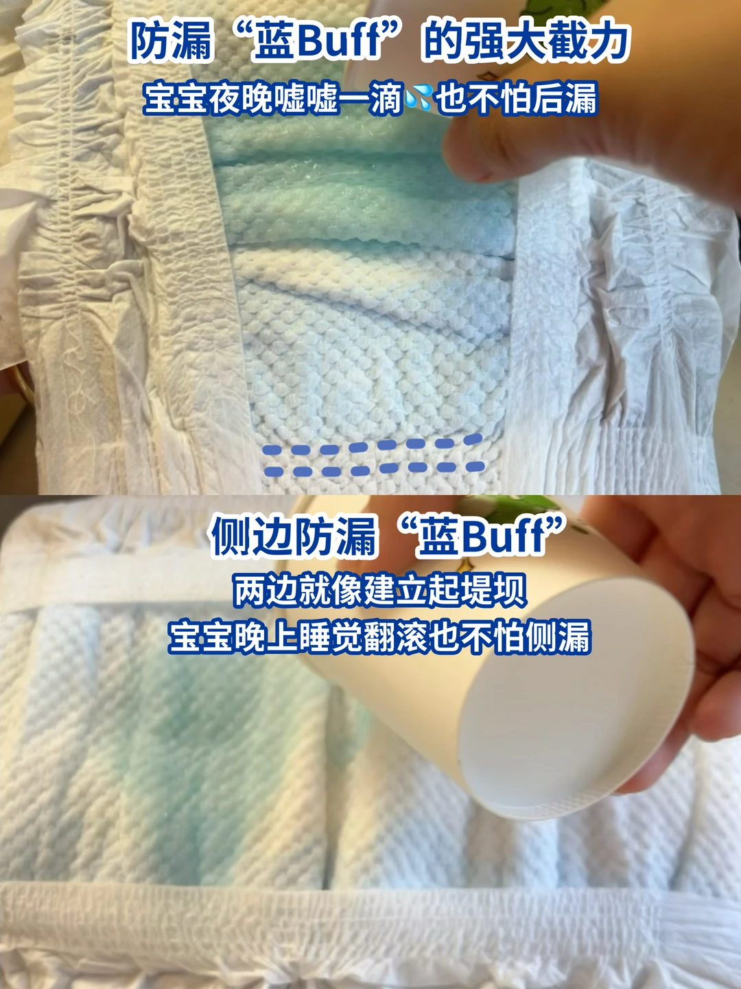 防漏“蓝Buff”设计,在芯体四周设置加强版吸收区,形成隐形尿液屏障,不管宝宝什么睡姿都不会漏尿~宝宝可以安睡一整晚!