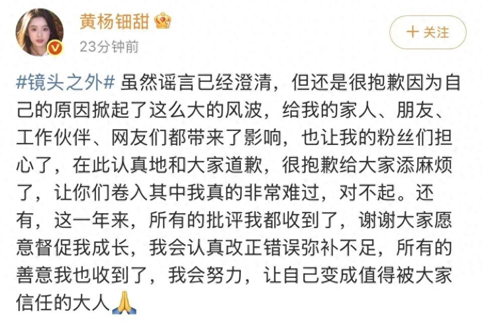 今天(4月27日)中午,黄杨钿甜发了条微博,配文是:“虽然谣言已经澄清,但还是很抱歉因为自己的原因掀起了这么大的风波……很抱歉给大家添麻烦了。”