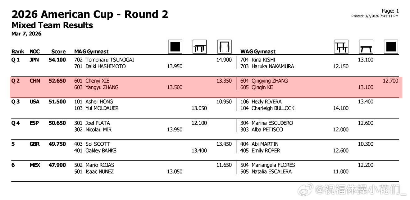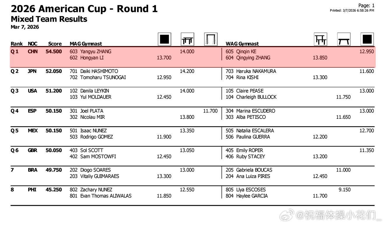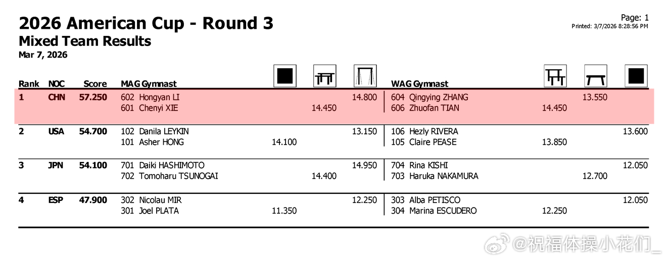 美国杯 中国队开年首战美国杯混合团体赛今早结束,由张清颖、柯沁沁、田倬凡、李鸿颜、谢晨屹、张杨煜组成的中国队,在自选顺序、逐轮淘汰、决赛一轮定胜负的新赛制下,出场顺序安排合理,虽有失误但相较别国已算相对稳定,分别以第一和第二在前两轮顺利晋级,并最终在决赛轮以57.2分大比分优势夺冠。东道主美国队以54.7分获得亚军,日本队以54.1分获得铜牌。