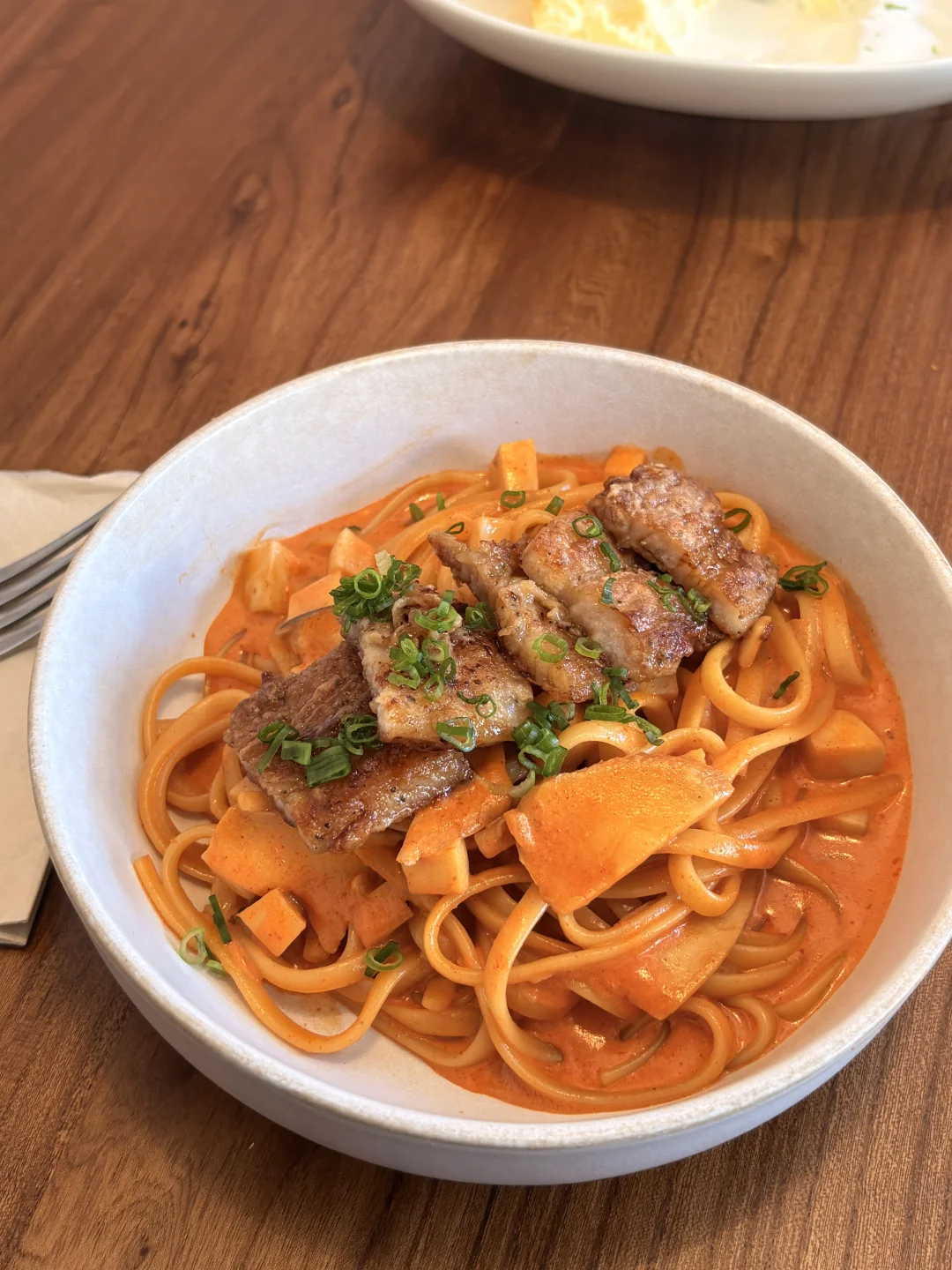 奶油味很浓郁,也不是很辣,调味刚刚好~配上煎过的五花肉,香!