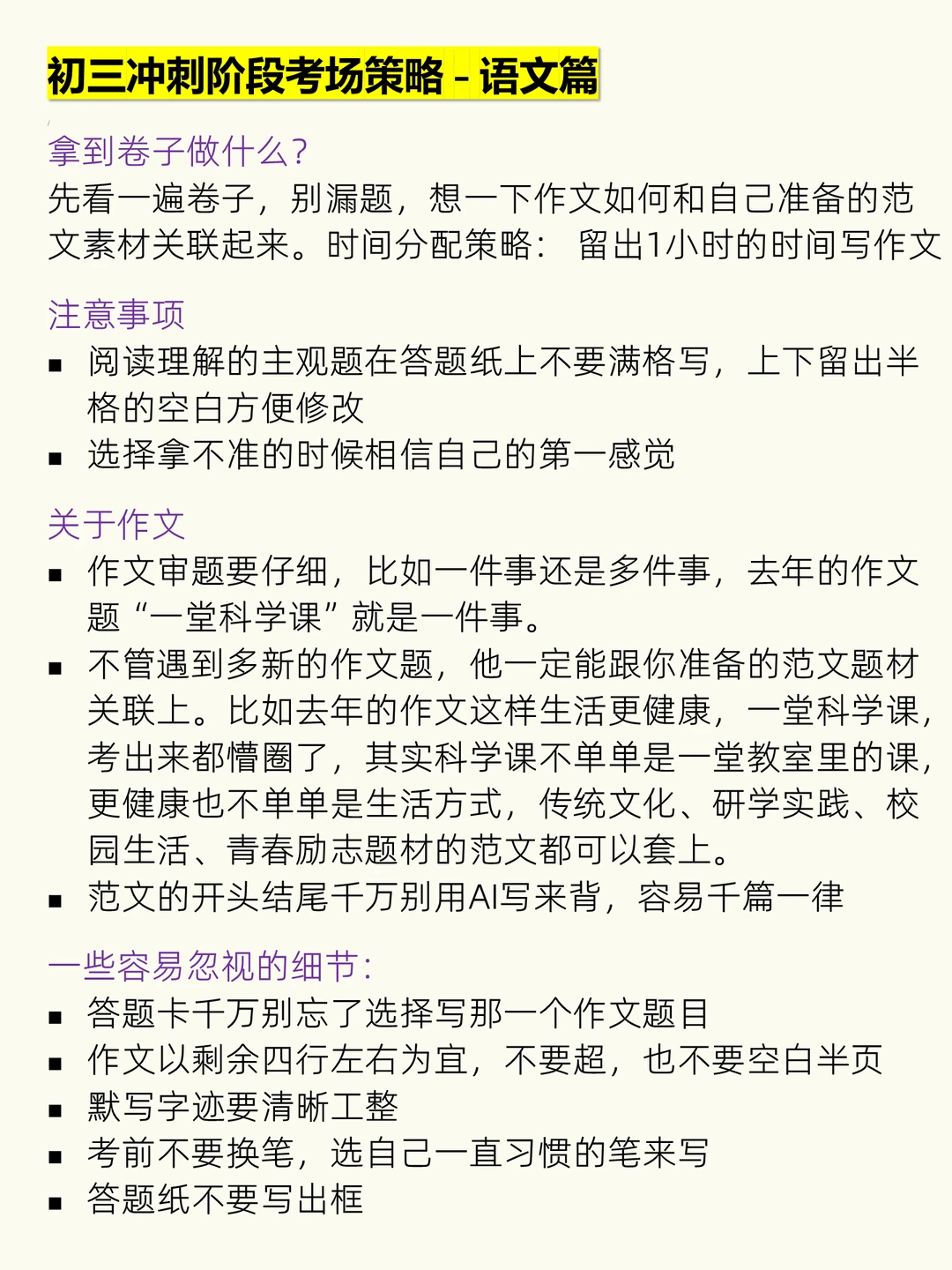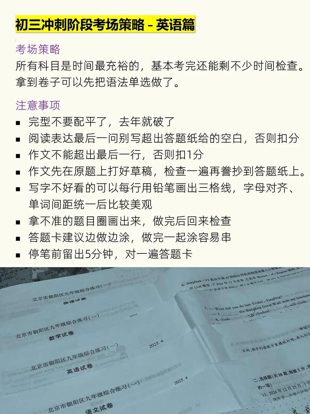先扫全卷,想作文怎么套素材,留足1小时写作文。阅读主观题答题纸留半格空白方便修改。选择拿不准信第一感觉。作文审题看清“一件事还是多件事”,千万别用AI写开头结尾,别忘勾选作文题目,字数剩四行左右为宜,字迹工整不出框