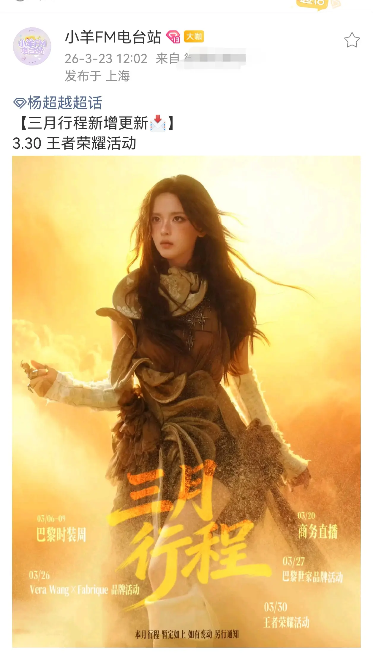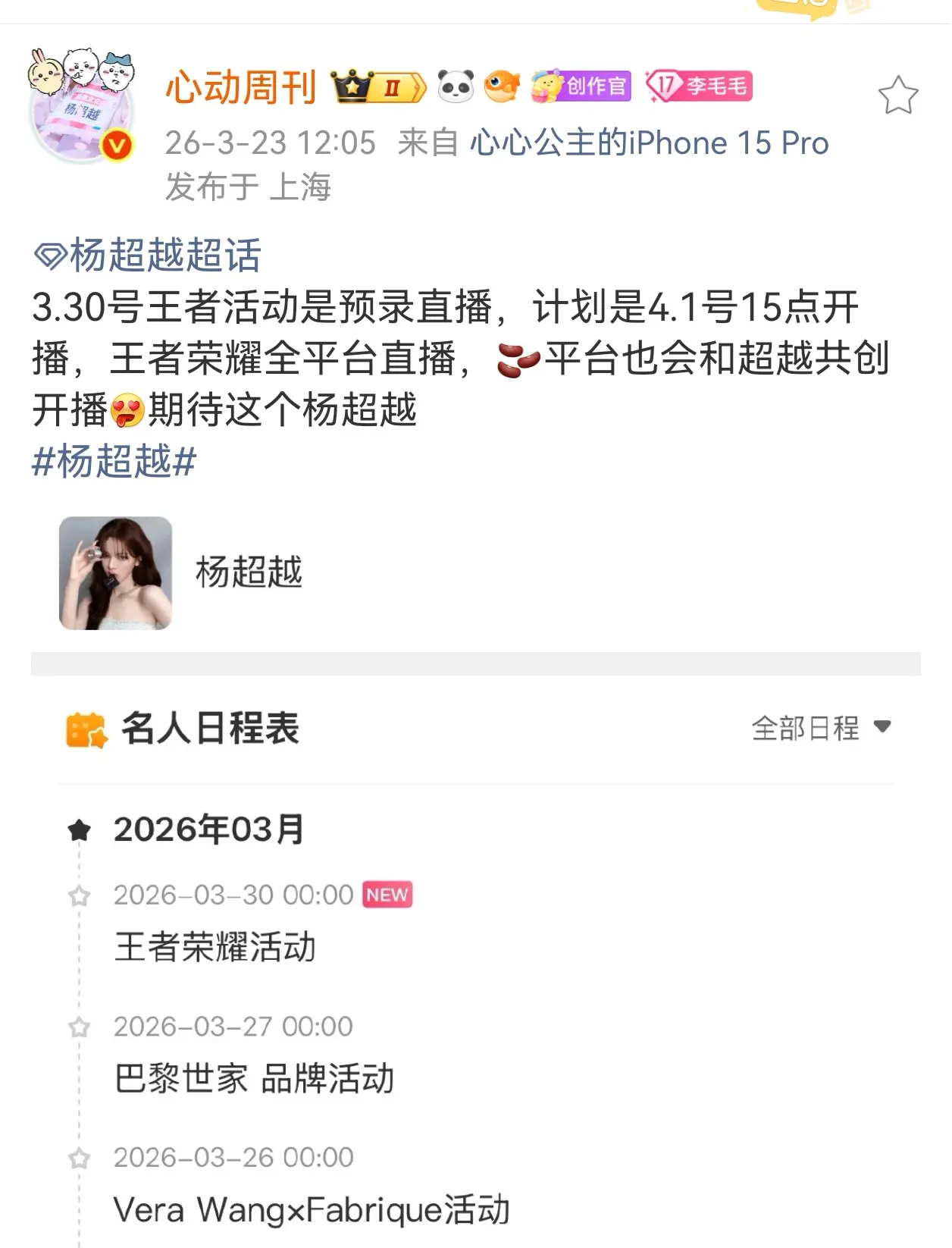 杨超越三月行程新增王者荣耀活动!!3.30号王者活动是预录直播,计划是...