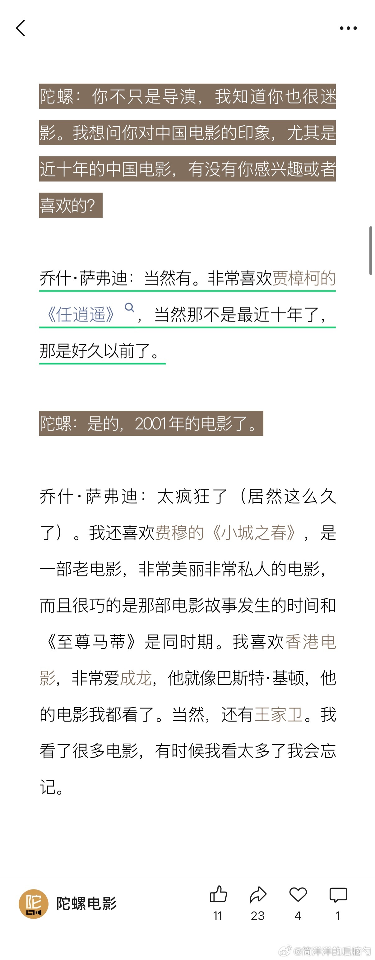 除此之外关于中国电影,乔什还喜欢费穆导演的《小城之春》,成龙和王家卫