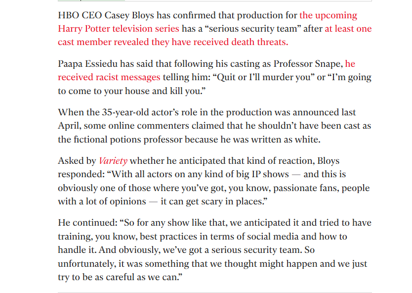 去年四月,Paapa Essiedu出演该剧的消息官宣时,一些网友声称他不应该被选中扮演斯内普教授,因为原本这个角色被设定为白人。