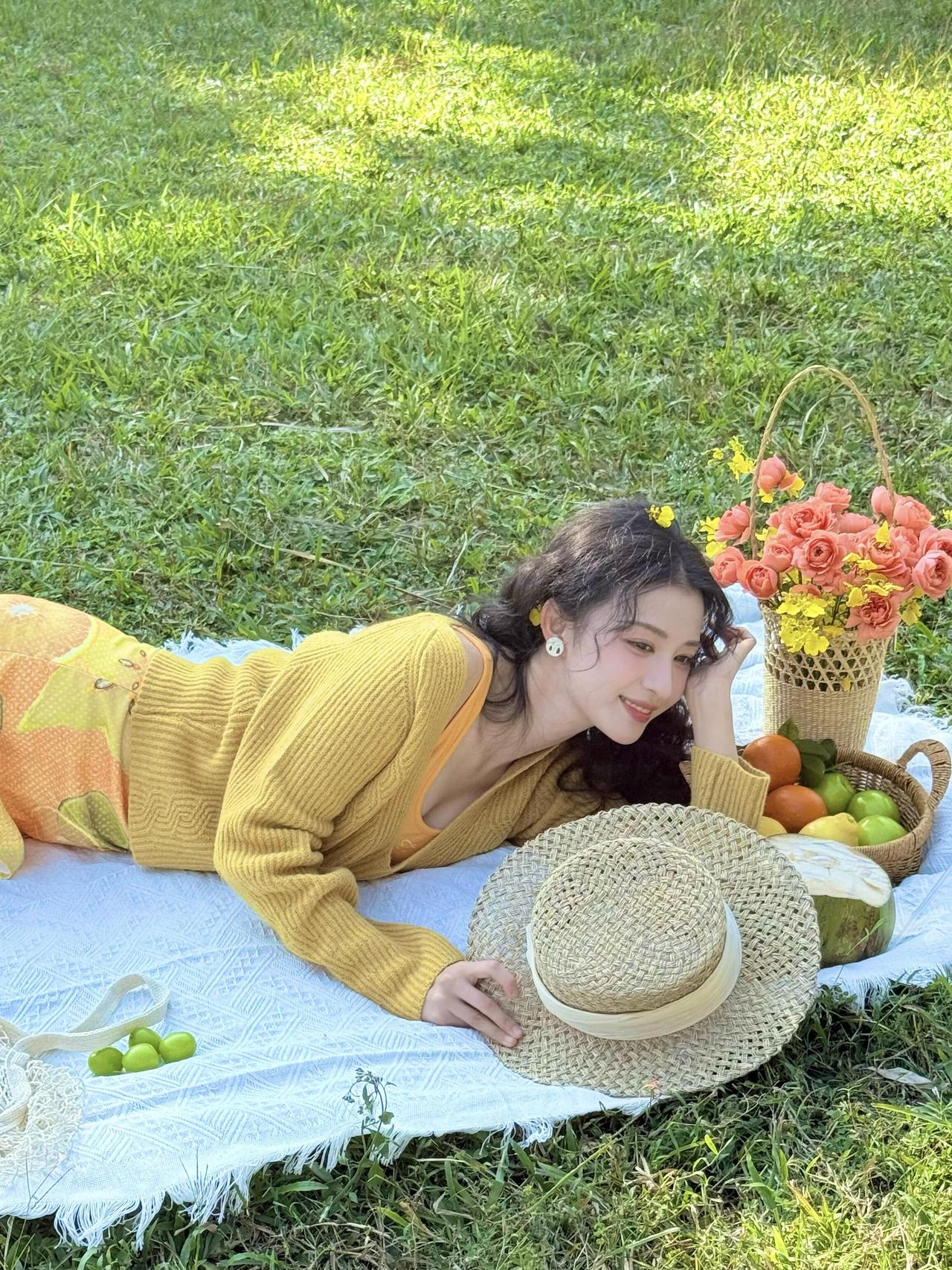 撒在青草地的野餐垫上
