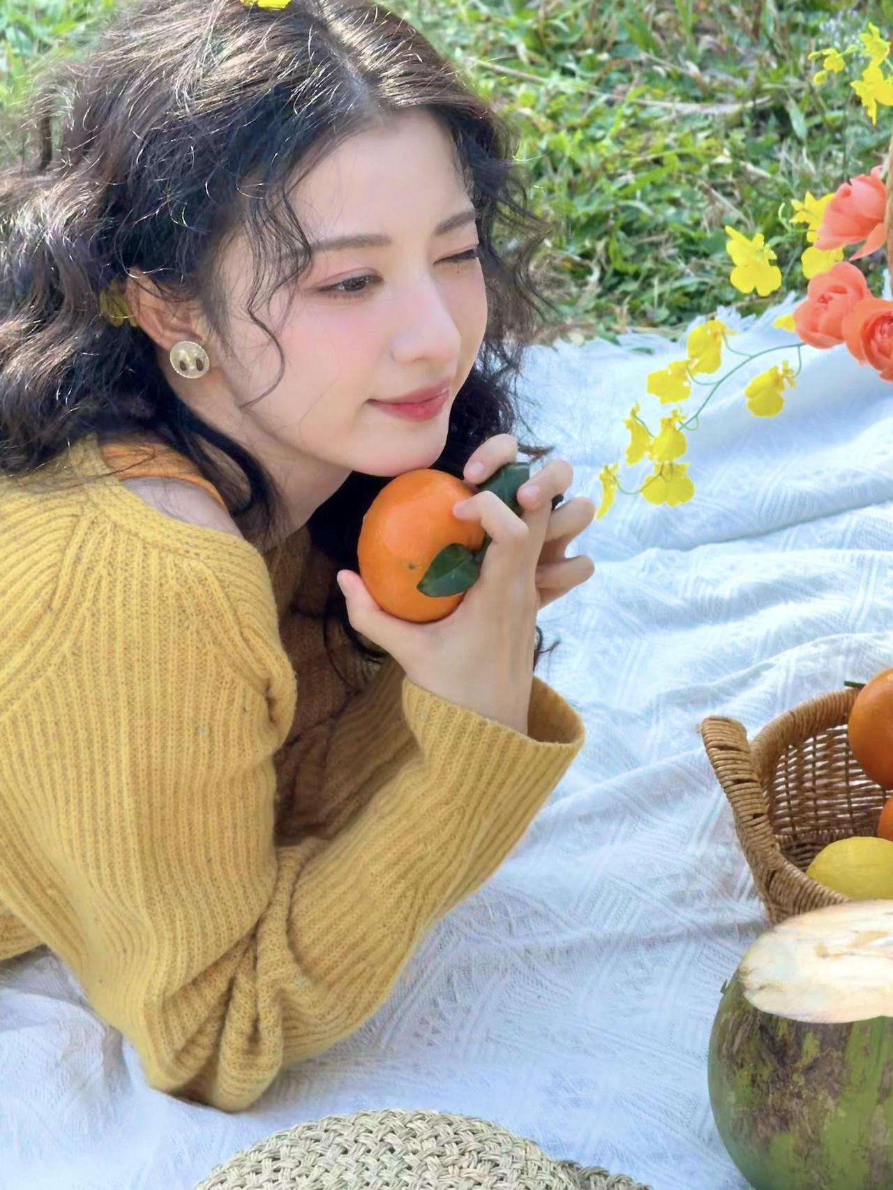 指尖捏着橙果的甜
