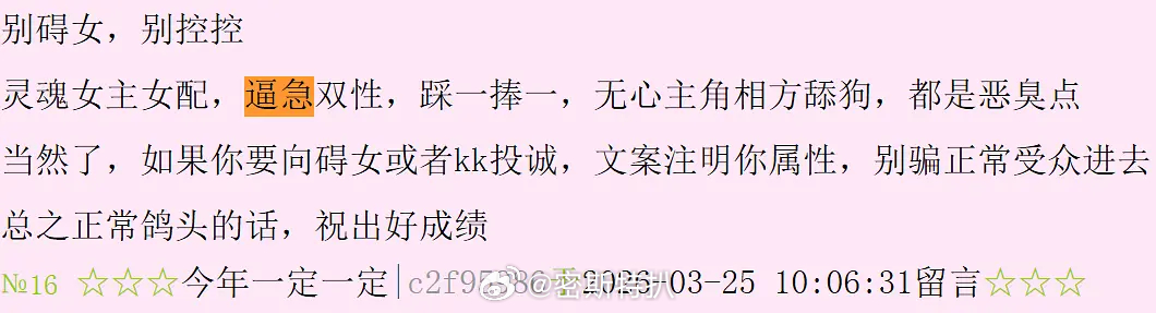 科普一下,晋江耽美版管bg叫“逼急”“碧鸡”恨bg到什么程度呢,就是看到你谈到女的,就会直接骂逼急。已经是十多年的惯例了。如果无法避免不可不提女的,必须“先给其他姑娘们道歉”,然后才能提女的晋江疯了
