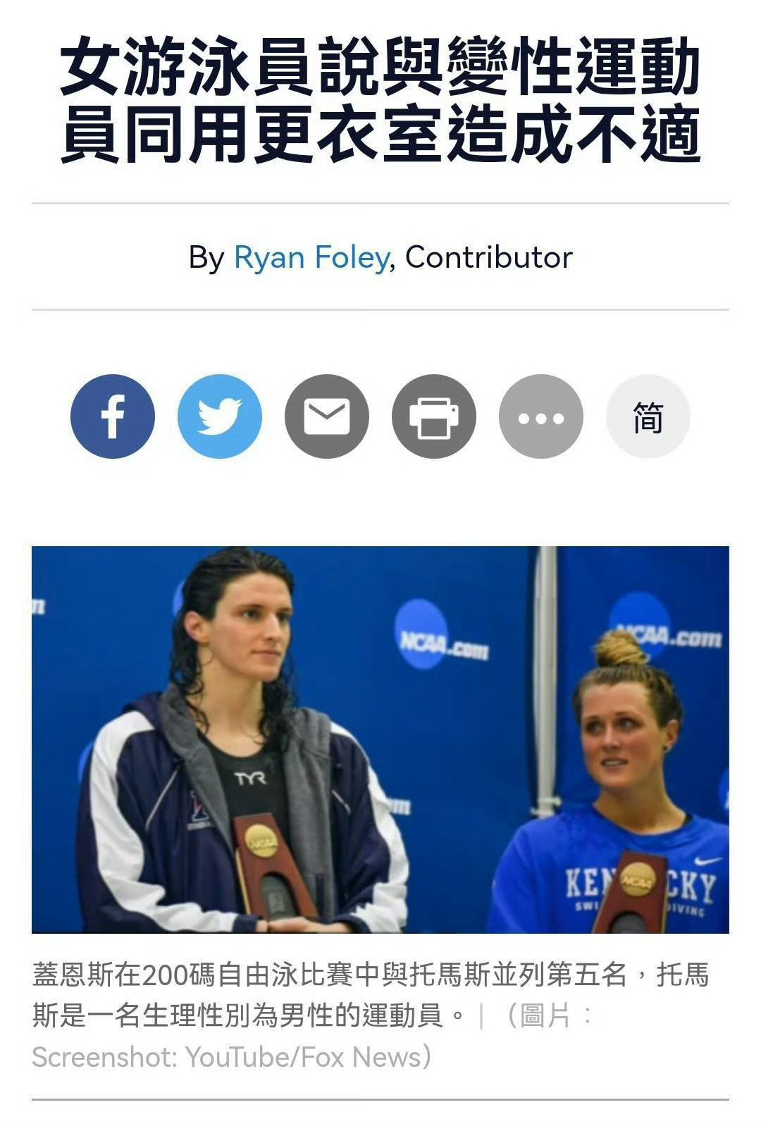 Thomas 未完成变性手术,然而因所谓的政治正确,Thomas 与其他女运动员共用同一更衣室,有时其他女运动员被迫看到 Thomas 未切除的部位……女运动员对此表示反对,却被美国民主党媒体定义为“歧视跨性别者”。