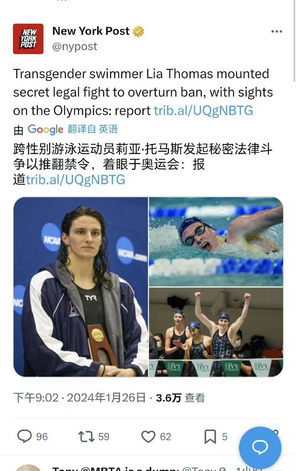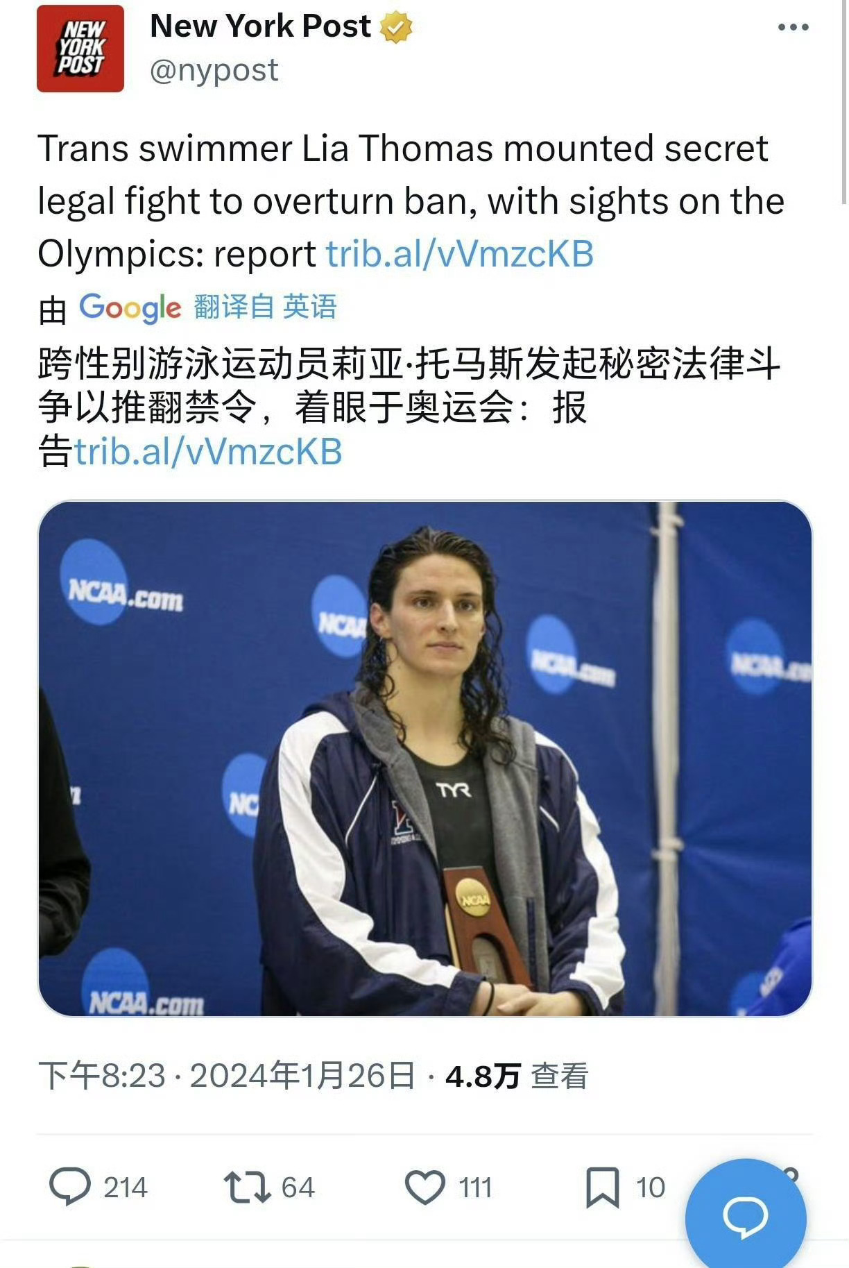 著名跨性别运动员lia Thomas曾发文抗议特朗普特朗普抢功奥运会女性参赛新规 这人我之前发过。Lia Thomas,生理性别为男,但自认为女性,并在美国国内参加女子比赛。原本只是一名普通的男子游泳运动员,在男子游泳里面成绩不入流,在宣布自我认同为女性后,未做手术便参加女子比赛,且屡次获奖。