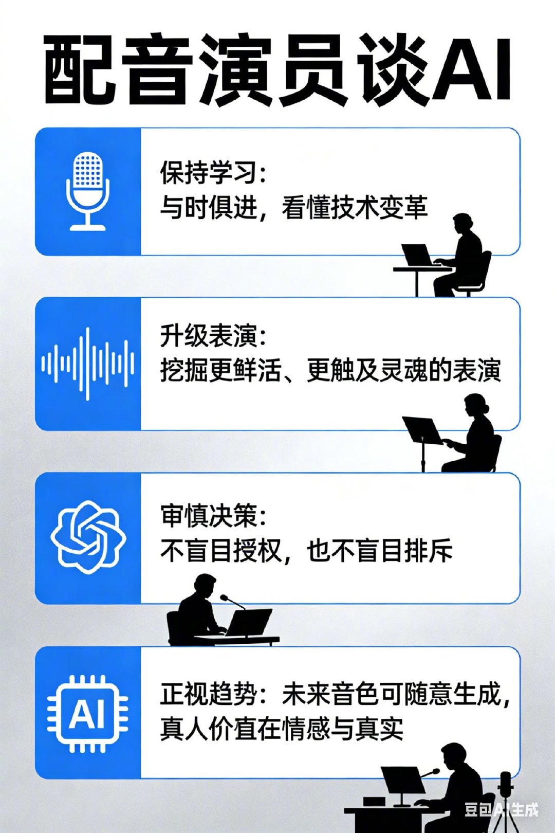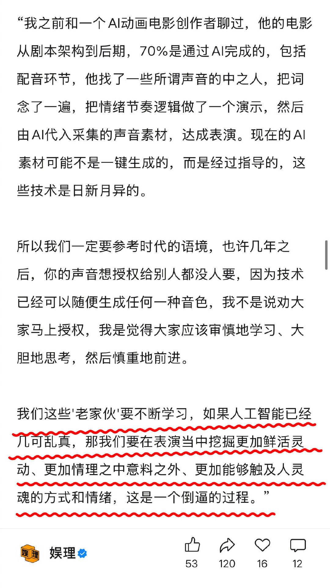 姜广涛回应配音演员被AI偷走声音 配音演员维权有多难?姜广涛说一是声纹鉴定难,二是即使胜诉赔偿金额也不惊人。“声音只是类似于肖像的一部分,并不会特别去讨论配音演员的声音到底有什么了不起。但其实配音演员的声音训练有素,而且是全表情的,天然适配被投喂AI进行素材采集。" 姜广涛谈配音演员向AI维权