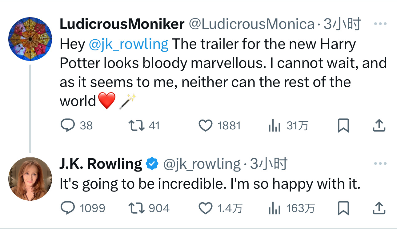 JK·罗琳在HBO《哈利·波特》剧集首支预告发布后,首次对剧版改编作出回应:“这