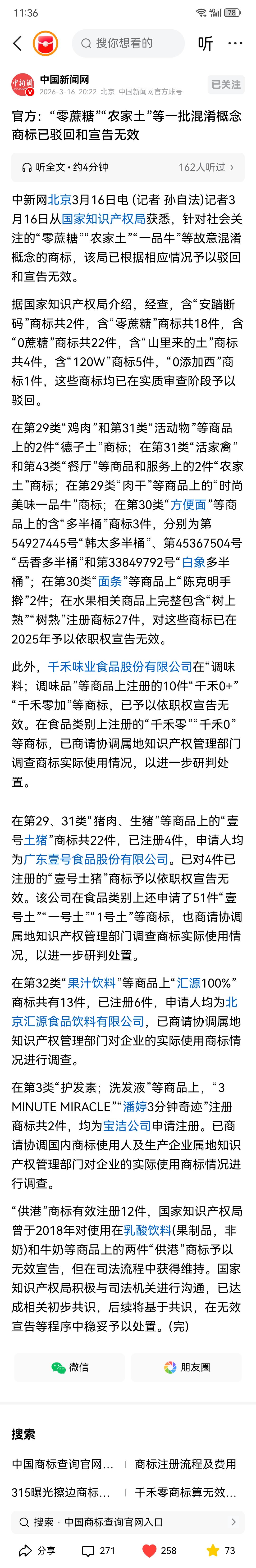 食品安全已经泛滥到非治不可的地步了… 终于看到了国家知识产权局从源头出手治理的操作信息(截图 附后),对于这一点,“南充瞭望哥”很是感慨! 这样说吧!在“南充瞭望哥”看来:国家知识产权局驳回、宣告“零蔗糖”“农家土”等混淆概念商标无效,精准打击商标注册“文字游戏”,守护消费者知情权、维护市场公平,彰显知识产权监管精细化升级。 但是,毫不客气地说,在“南充瞭望哥”看来,这种“隔靴搔痒”、没有半分惩治力度的驳回做法显然不够,显然难以根治这种乱象。 “南充瞭望哥”认为,国家知识产权局也应该从中看到自己在履职上的“失职失责”,看到“亡羊”的漏洞在于自己的疏忽,继而在“亡羊”后迅速“补牢”筑牢起商标监管防线,构建起“源头治理+全链惩罚”体系,同时还要完善行政处罚与民事赔偿机制建立与衔接、在引入惩罚性赔偿基础上,打通跨部门信息壁垒、斩断恶意申请产业链,推动商标监管与产品质量监管协同,让商标回归本源价值。 当然了!此次处置也应该是监管精准发力的一个信号,只是希望这信号放出来后加强好源头严审、过程严管、违法严惩的全链条监管,早点肃清商标乱象,让市场竞争回归品质与创新。 … “南充瞭望哥”还需要说明的是:中国的食品安全问题,还不仅仅是商标治理,还需要从原材料供应、生产、销售全流程发力,从法律上从严从重,杀一儆百才行。 中国的食品安全问题已经泛滥到了非治不可的程度了,希望国家知识产权局这一波操作的后面,还有更多的连贯动作、还有更多的“管事部门”加入其中真正“管起事来”…… (南充瞭望哥)