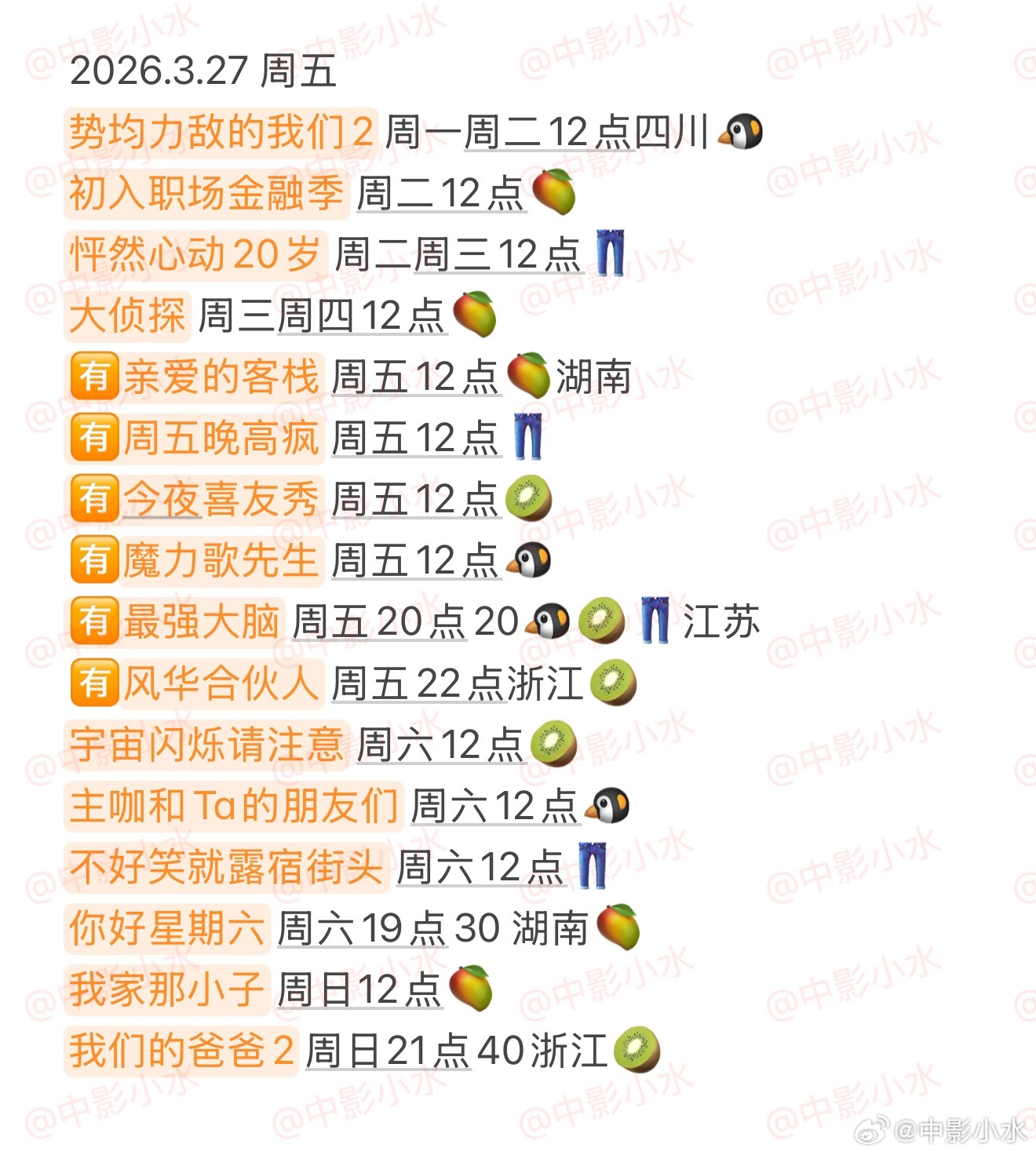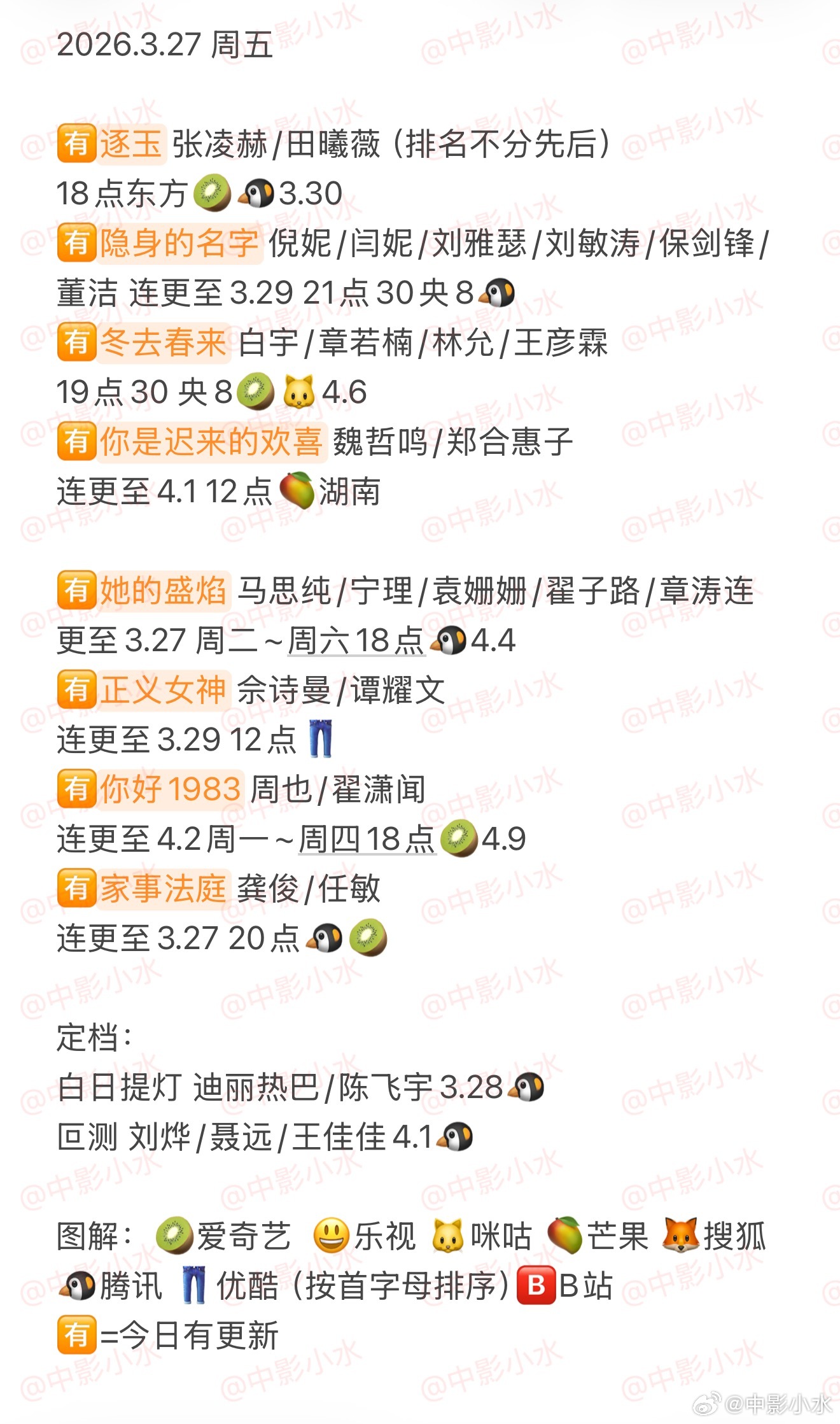 拯救剧荒 3月27日,今晚看点啥??图1 追剧日历 图2 综艺日历 图3 已完结剧集 🈶逐玉 张凌赫/田曦薇(排名不分先后)🈶隐身的名字 倪妮/闫妮/刘雅瑟/刘敏涛/保剑锋/董洁🈶冬去春来 白宇/章若楠/林允/王彦霖🈶你是迟来的欢喜 魏哲鸣/郑合惠子
