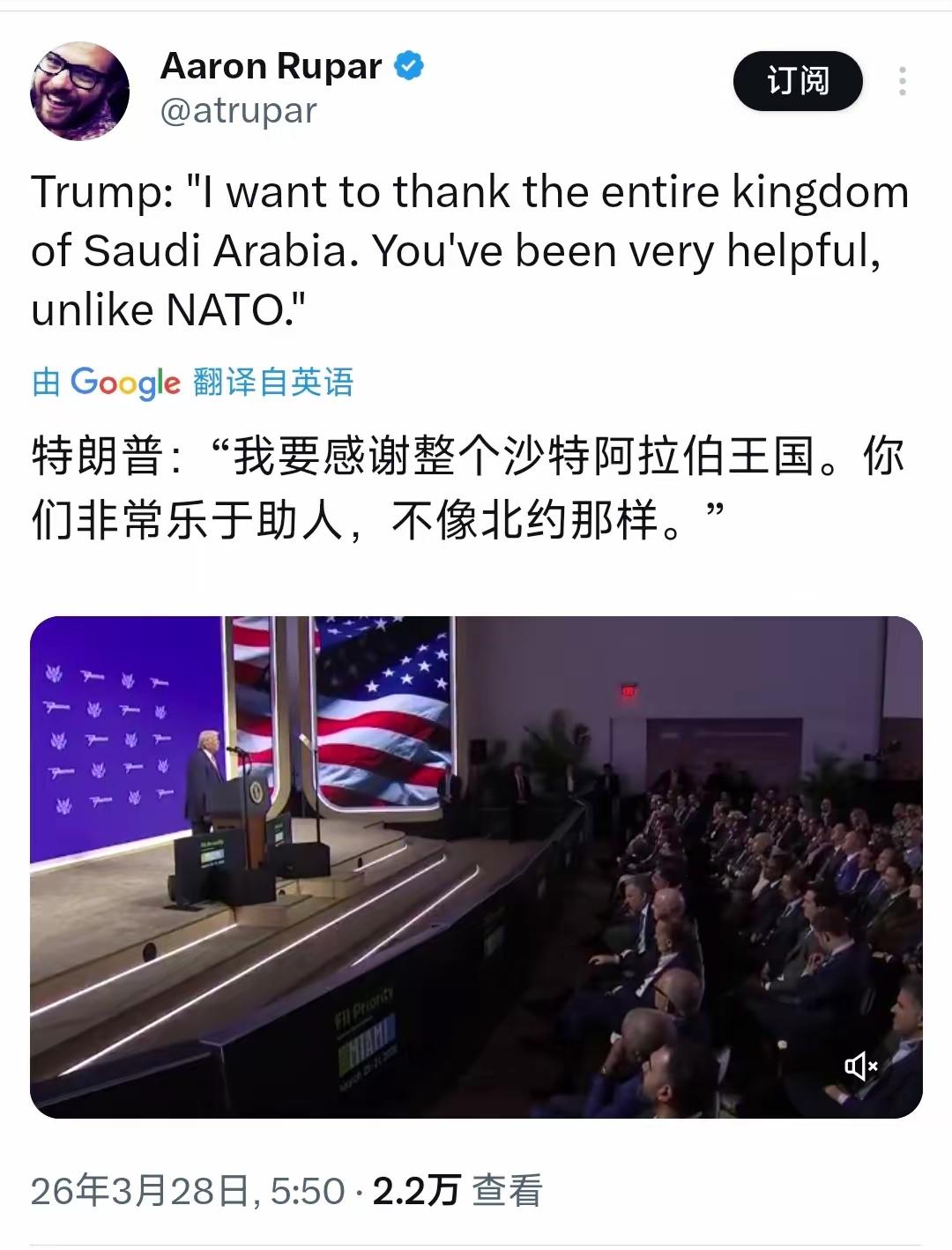 特朗普今天(北京时间3月28日)在演讲中表示:“如果发生大地震,我敢保证北约不会在那里。我要感谢整个沙特阿拉伯王国。你们非常乐于助人,不像北约那样。我不得不说,巴林和科威特比北约更挺身而出。”