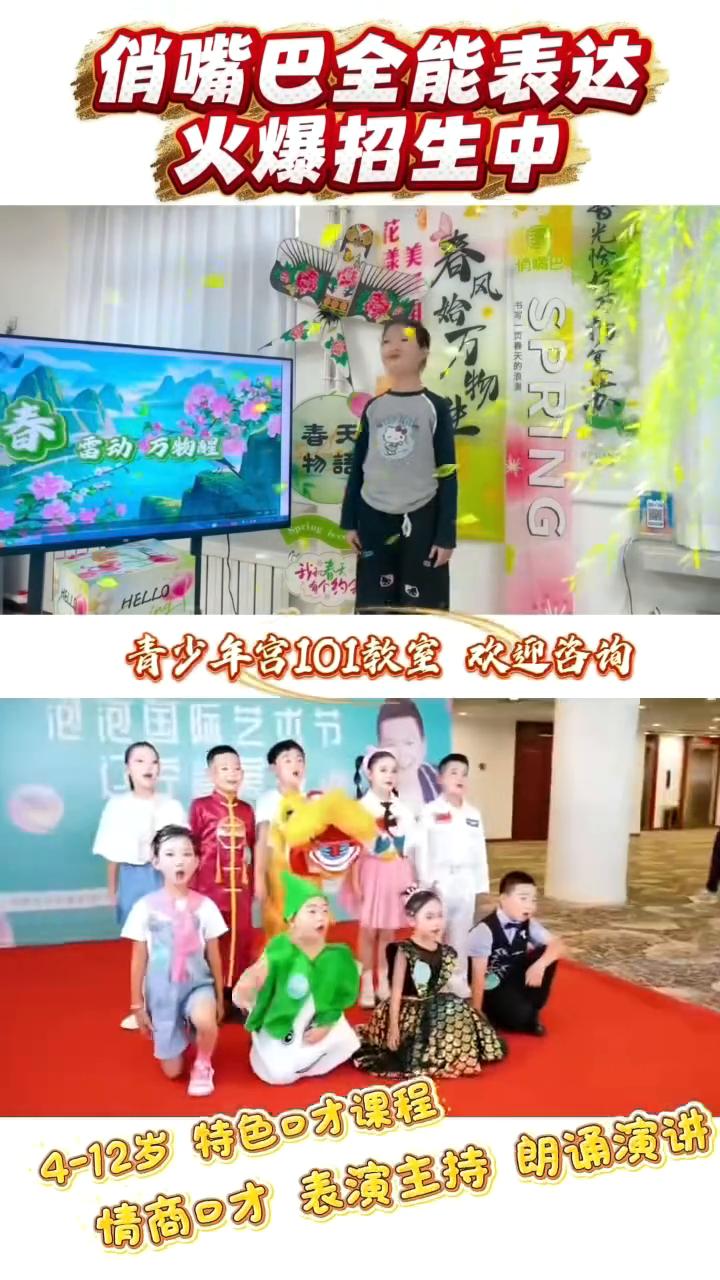 俏嘴巴全能表达火爆招生中。 青少年宫101教室欢迎咨询。学新的孩子们你们好,4-12岁特色口才课程,情商口才表演、主持朗诵演讲,300个孩子参加古风盛宴。今天我将带领30名优秀学员来一同感受中华五千年的诗词文化。 新学期我们要好好学习,哥哥姐姐别紧张,就像平时写作业一样,把智慧都写在试卷上冲。哥哥姐姐加油,每道题都像小怪兽,你们一定能全部打败,考出超高成绩。