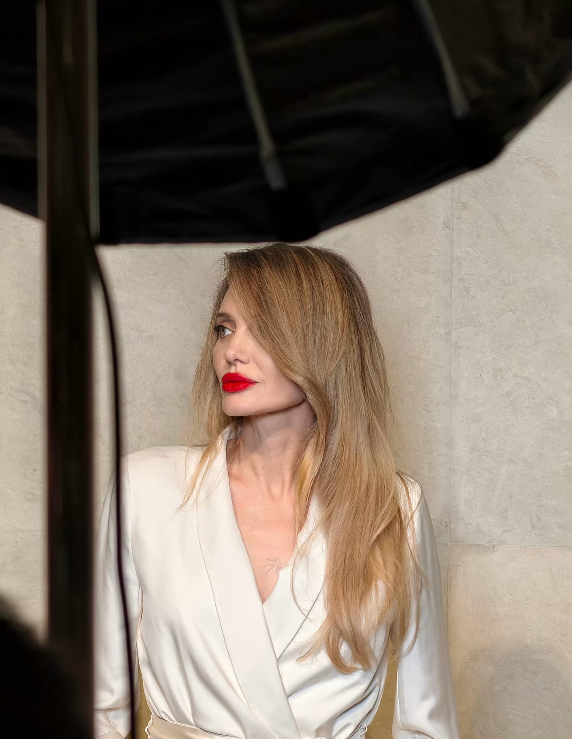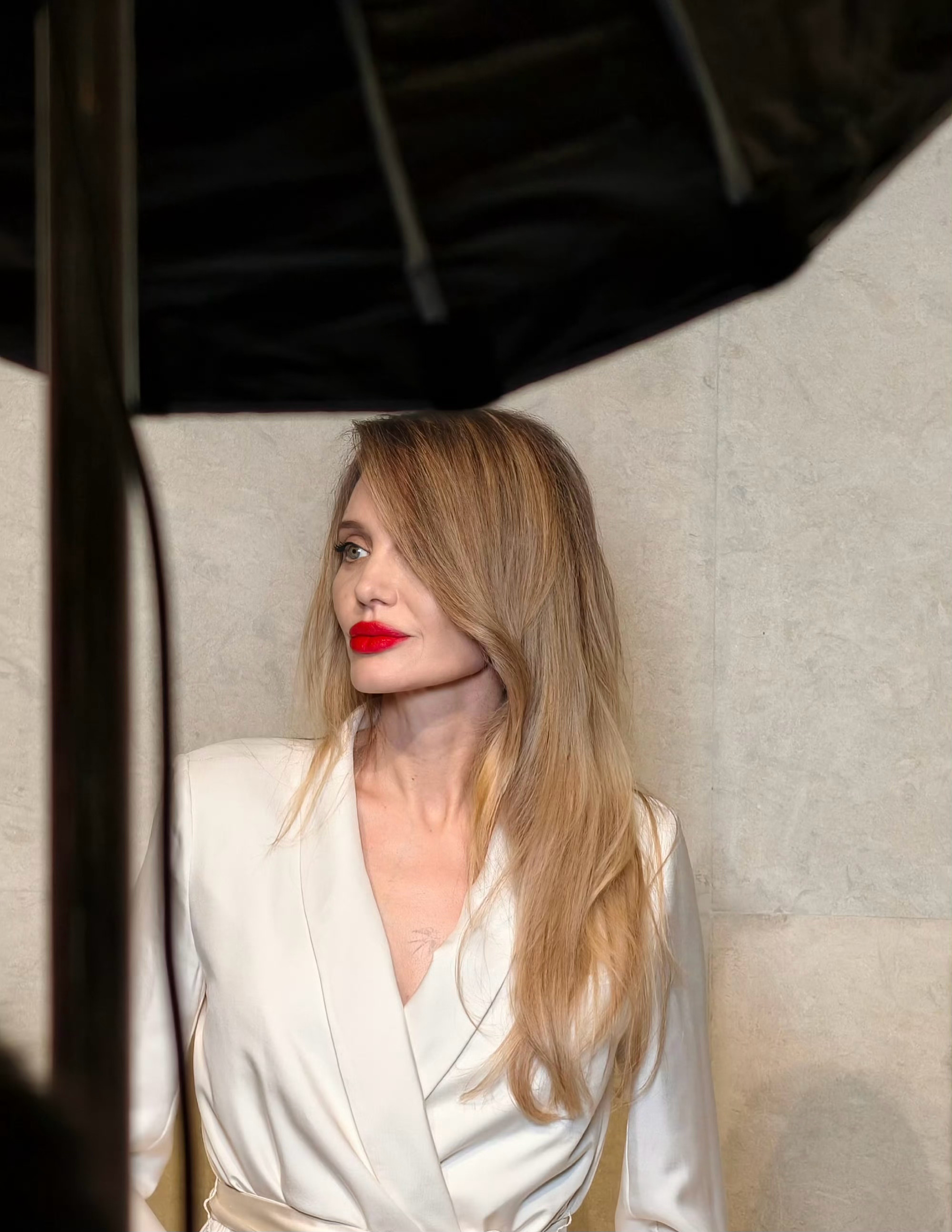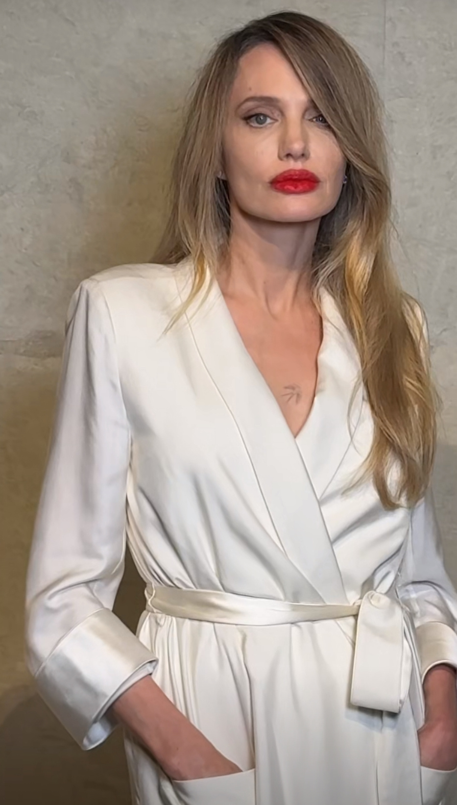 Angelina Jolie一身白裙搭配红唇造型亮相上海TOM FORD BEA