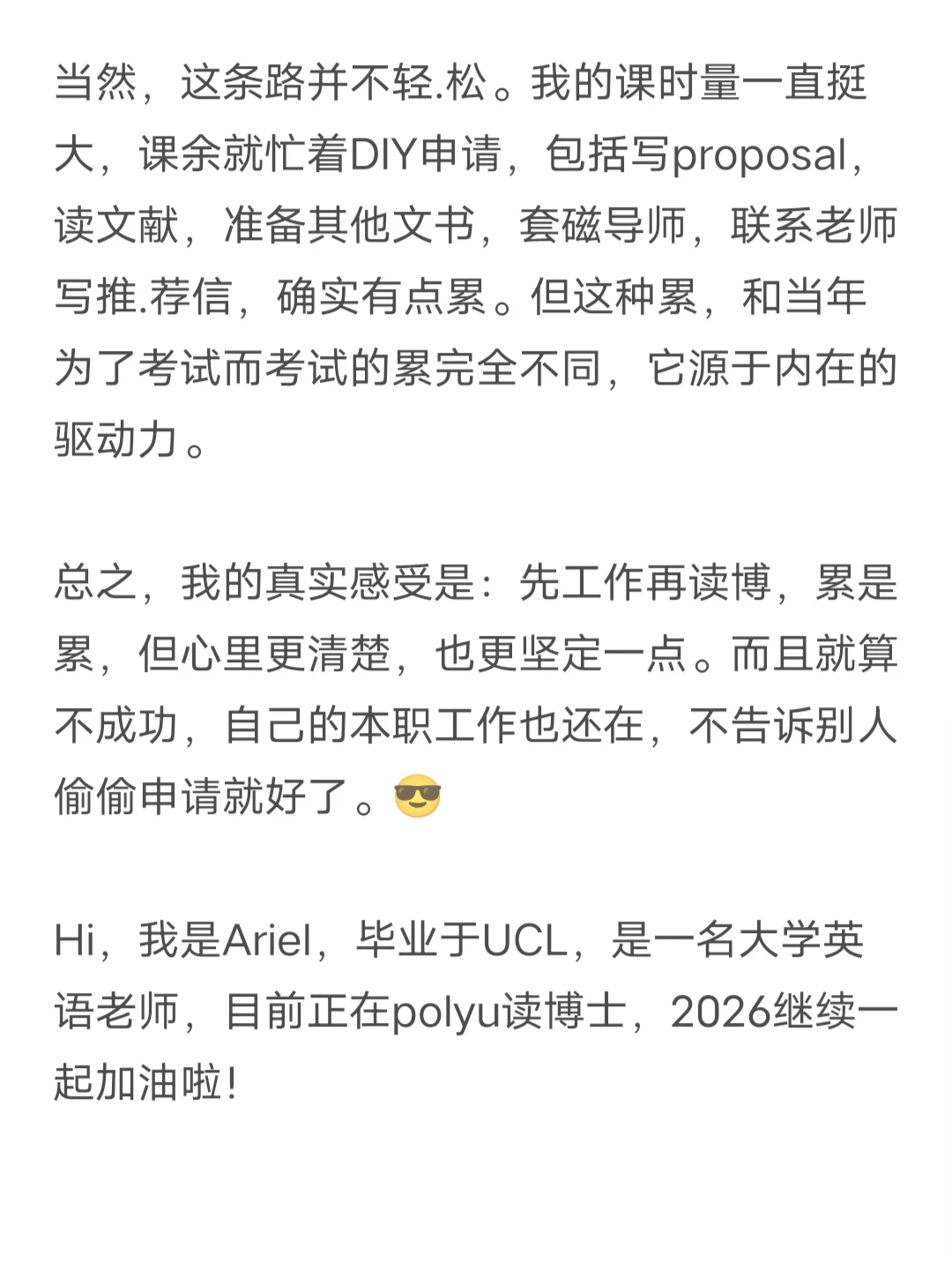 Hi,我是Ariel,毕业于UCL,是一名大学英语老师,目前正在polyu读博士,2026继续一起加油啦!