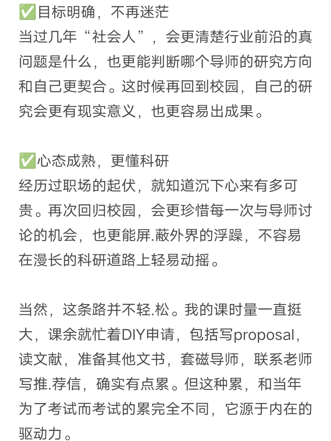 经历过职场的起伏,就知道沉下心来有多可贵。再次回归校园,会更珍惜每一次与导师讨论的机会,也更能屏.蔽外界的浮躁,不容易在漫长的科研道路上轻易动摇。