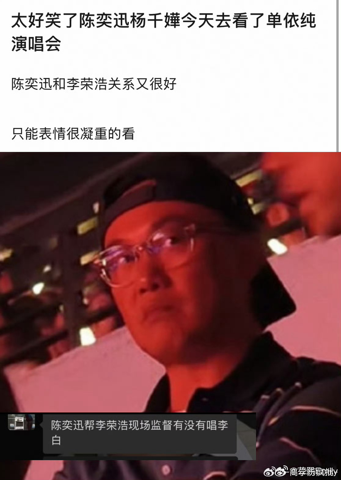 陈奕迅 路一直都在原唱笑不活了!陈奕迅本人坐在单依纯演唱会现场,直接坐进全网最大瓜田中央😂李荣浩刚维权完《李白》,好兄弟陈奕迅就现身演唱会;这边吴向飞还在控诉《路一直都在》,原唱正是陈奕迅;杨千嬅也来了,整个乐坛圈直接乱成一锅粥。网友神吐槽:陈奕迅该不会是李荣浩派来的卧底,现场督查有没有唱《李白》吧!原唱本人在台下听翻唱,这剧情比连续剧还抓马,内娱果然是个圈,绕来绕去全是熟人!