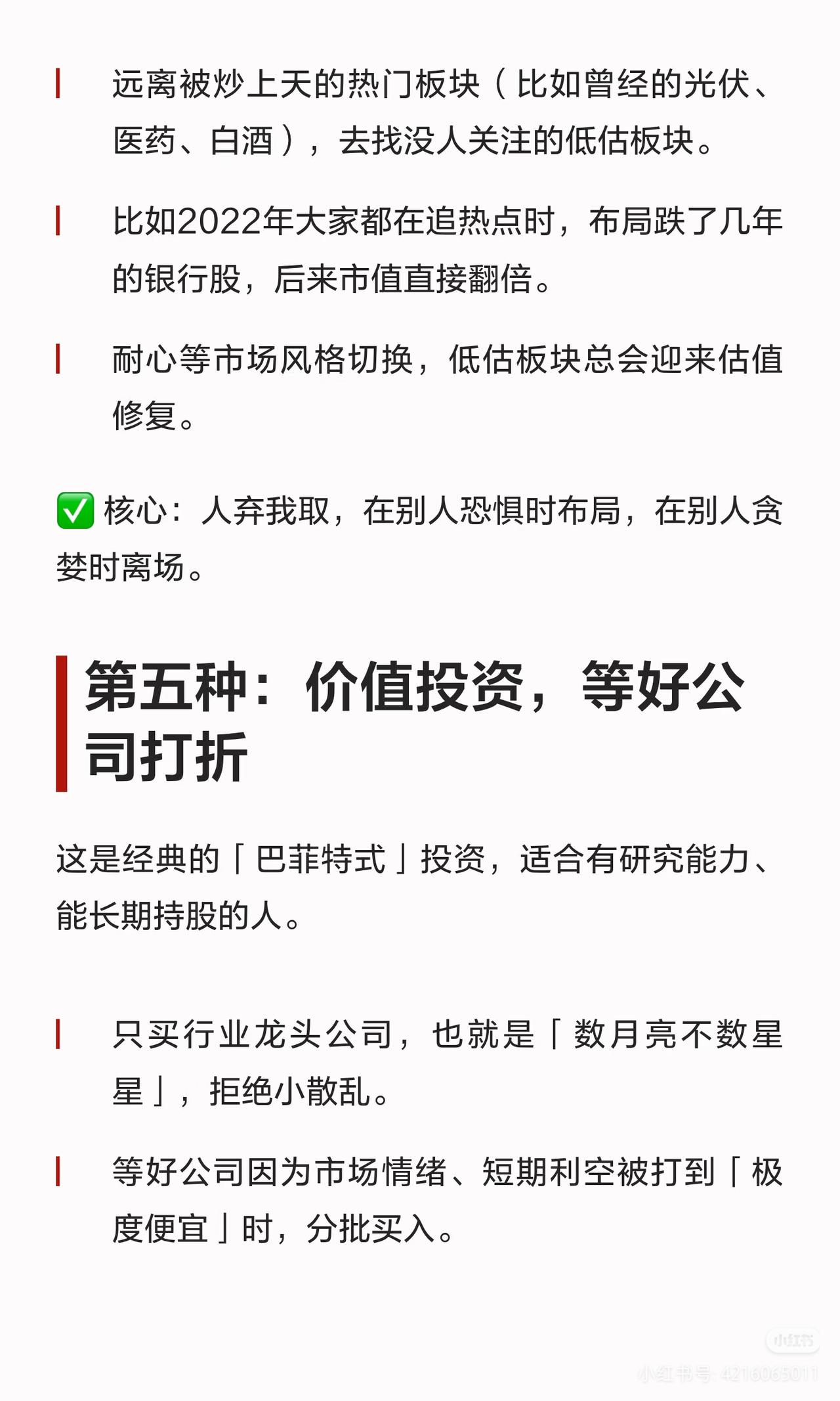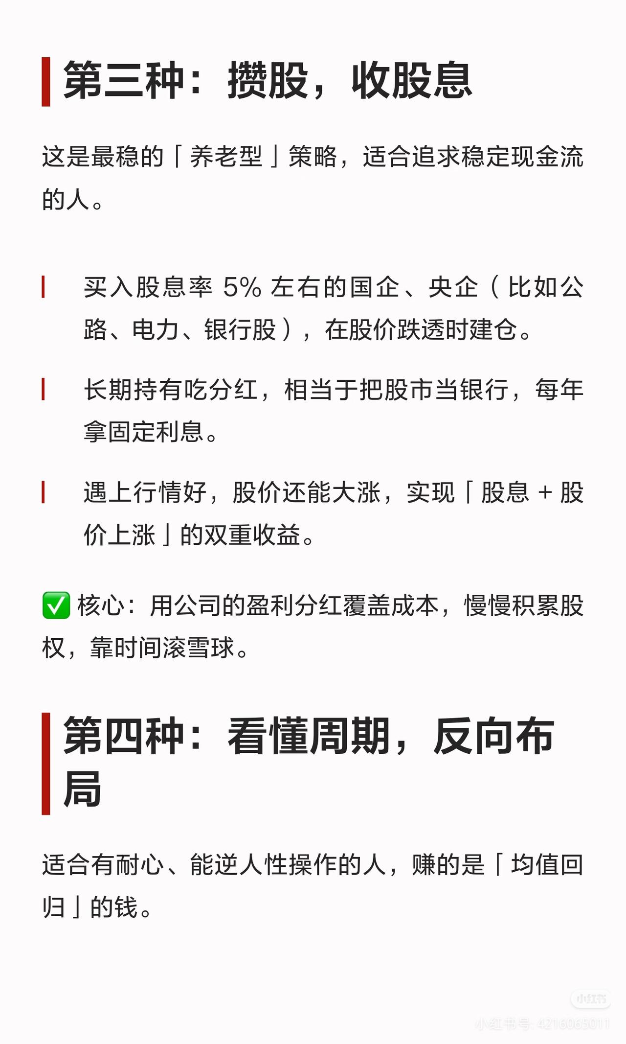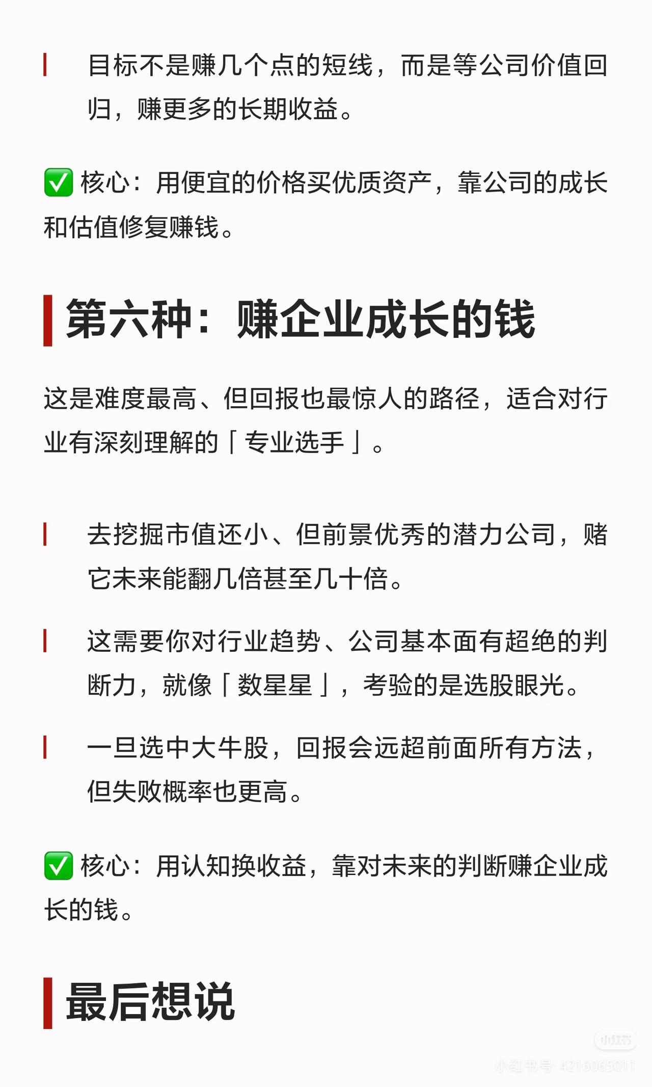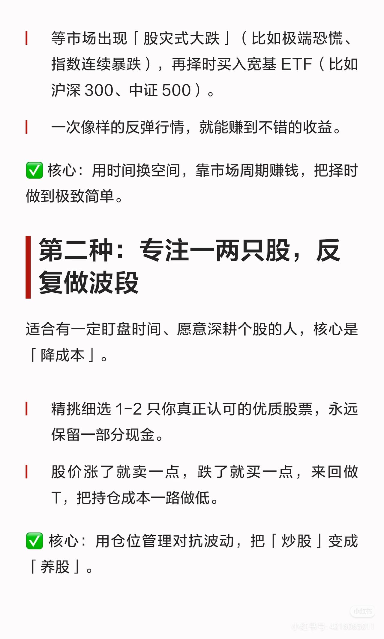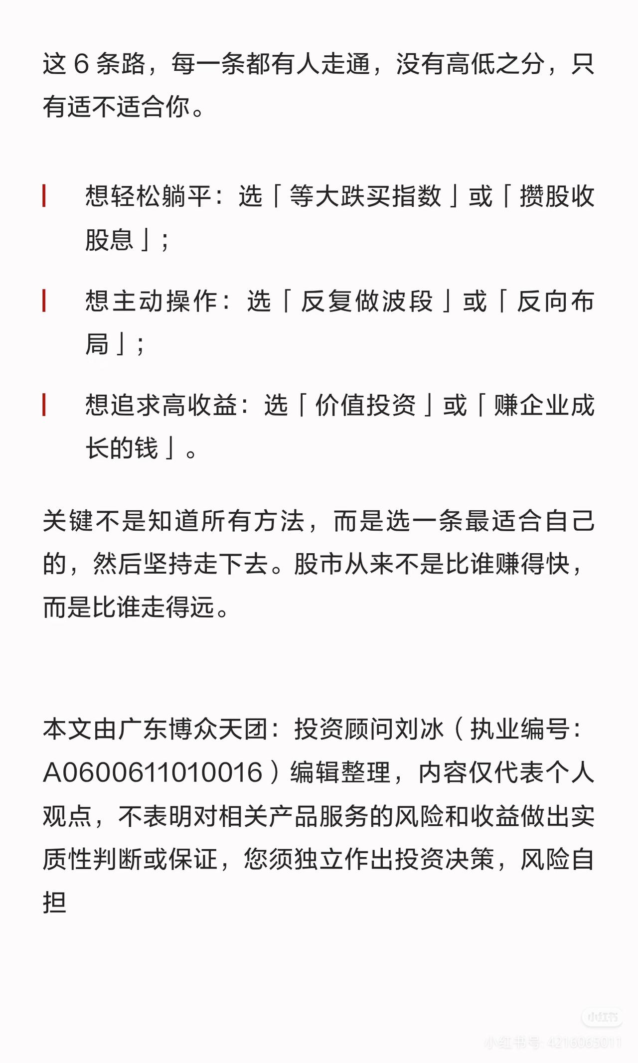 散户炒股别瞎忙!6种赚钱方法,选对一条就够了 天天追热点、听消息、满仓梭哈,到头来钱没赚到,心态先崩了? 其实不是你运气差,是没选对适合自己的路!普通人在股市赚钱的6种方法,从懒人躺平到专业博弈,总有一条适合你👇 ✅ 【懒人躺平】等大跌买指数/攒股收股息 不用盯盘不用选股,闲钱投资,要么等股灾买宽基ETF,要么拿高股息国企吃分红,把股市当银行,稳稳躺赢。 ✅ 【主动操作】专注个股做波段/看懂周期反向布局 有时间盯盘就精选1-2只优质股来回做T降成本;能逆人性就远离热门,布局低估板块,等估值修复赚大钱。 ✅ 【追求高收益】价值投资等打折/赚企业成长的钱 只买行业龙头,等好公司被错杀时分批入手;或挖掘小市值潜力股,赌未来翻倍,用认知换超高收益。 股市从来不是比谁赚得快,而是比谁走得远!选对适合自己的路,坚持下去就赢了。 A股 散户炒股 投资干货 理财避坑 ⚠️ 免责声明:本文仅为逻辑分享,不构成任何投资建议,股市有风险,投资需谨慎。