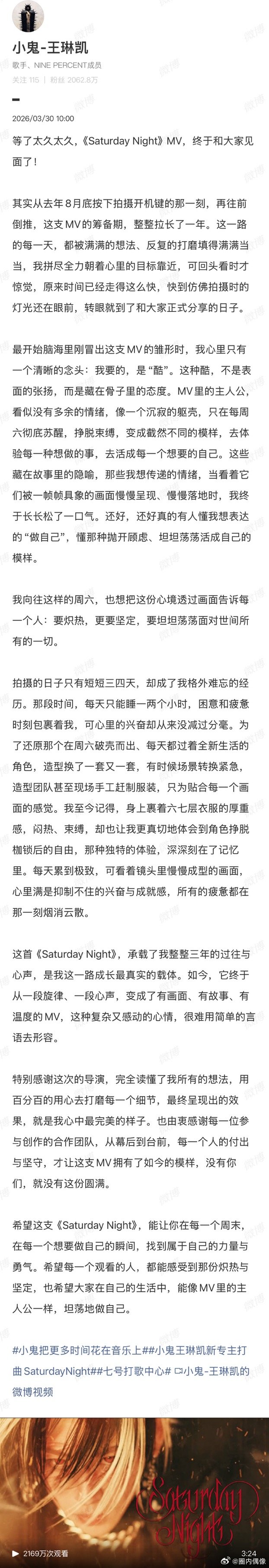 小鬼说没有你们就没有这份圆满 等了太久的《Saturday Night》MV终于上线!小鬼用一年筹备、三天拍摄,把藏在骨子里的“酷”与“做自己”的态度,装进每一帧画面里!