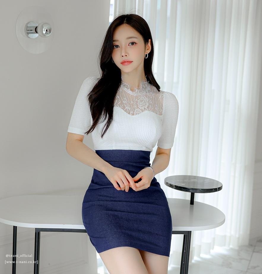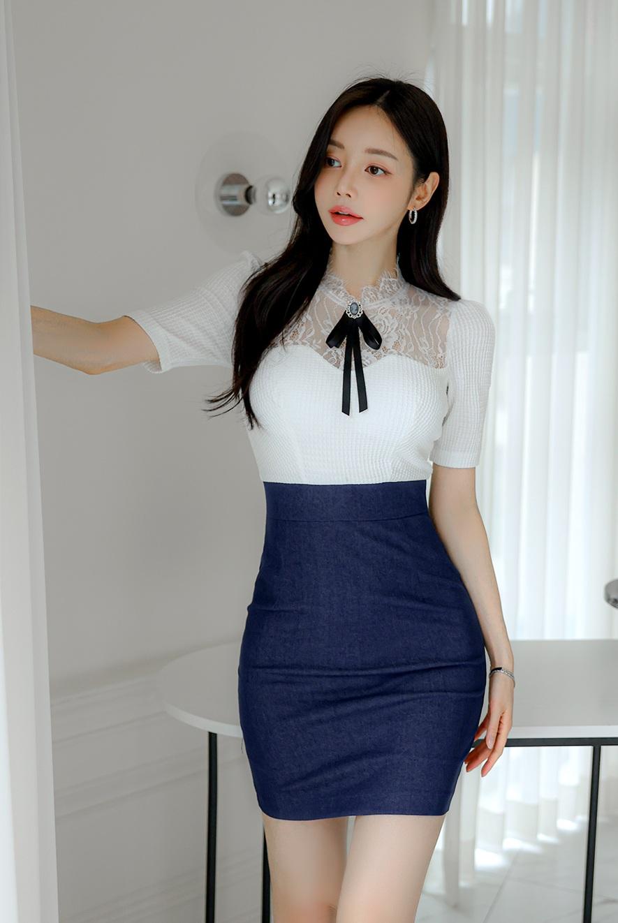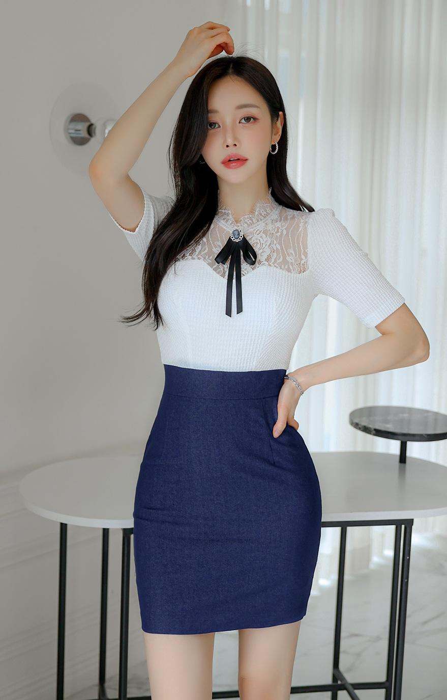优雅气质穿搭,白色蕾丝上衣搭配深蓝色短裙,简约时尚!