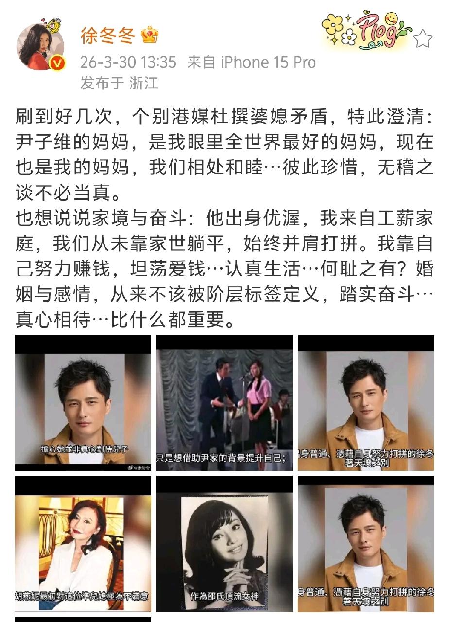 3月30日,徐冬冬发文辟谣婆媳关系不好传闻,徐冬冬说经常刷到有个别港媒杜撰她和老公尹子维妈妈关系不好,说什么尹子维妈妈胡燕妮看不起徐冬冬的出身,觉的她配不上儿子尹子维。 尹子维妈妈胡燕妮年轻时是邵氏影坛的传奇女星,地位就相当于现在的顶流女明星,尹子维爸爸也是一位演员,尹子维出身正宗的影视世家,妥妥的星二代出身。 而徐冬冬来自工薪家庭,在家世上确实比不上尹子维家,但在娱乐圈发展上徐冬冬一点也不比尹子维差,两人旗鼓相当。 至于港媒杜撰的徐冬冬和婆婆胡燕妮关系不好,就是无稽之谈,徐冬冬说婆婆胡燕妮在她眼里是最好的妈妈,她们和睦相处,婆媳有爱,就是幸福的一家人。 所以有时候港媒报道的也不一定都是真的,我们要学会辨别真假传闻。