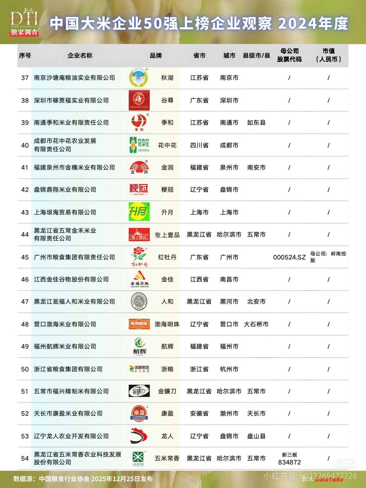 中国大米企业50强出炉!藏着3个扎心真相,买米、投资都要看 刚出炉的2024中国大米企业50强榜单,直接把大米行业的底裤扒得明明白白! ✅ 第一梯队断层领先:中粮福临门、益海嘉里金龙鱼、十月稻田稳居前三,全国性巨头霸榜,是咱们买米最稳的选择。 ✅ 地域格局太真实:黑龙江13家上榜,五常、方正两大产区撑起东北大米半壁江山,完美印证“北粮南运”大逻辑;广东、江苏等销区靠品牌运营强势突围。 ✅ 行业现状太扎心:54家上榜企业里,独立上市仅3家,CR5不足8%,万亿赛道极度分散,多数企业困在低毛利、低溢价的困境里。 买米认准榜单里的地理标志产区+国资/上市品牌,投资盯紧全产业链龙头,别踩坑! 大米 粮油 投资 民生