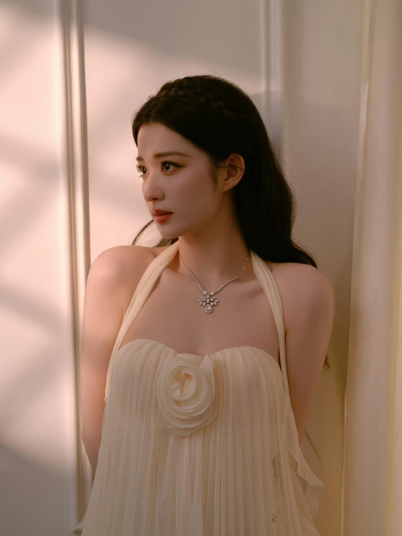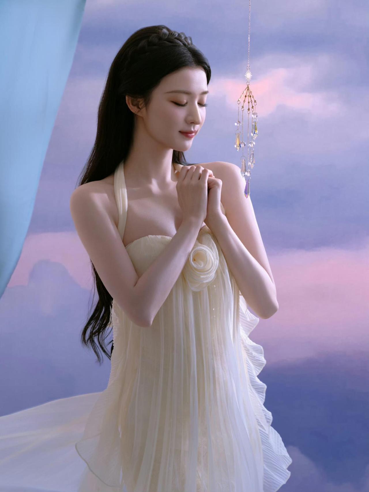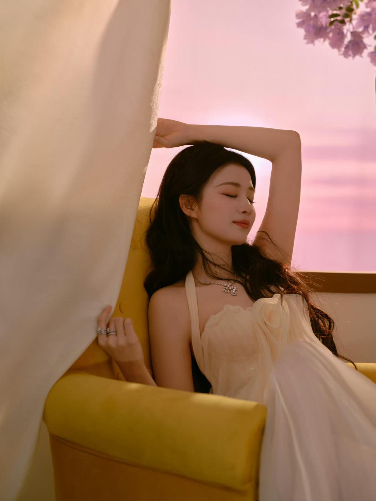 王楚然 风把云揉成淡粉的信笺 你站在光里,裙裾是未展开的诗行 水晶风铃晃碎了暮色 每一片折射的光,都落在你微垂的眼睫上后来你靠在暖黄的椅上 窗帘偷吻你的发梢 粉紫的晚霞漫过窗沿 像谁把黄昏,轻轻披在你肩上你不必伸手去摘星子 光会自己落下来 落在颈间的钻饰上 落在裙上那朵不肯谢的玫瑰里 落在你闭眼时,呼吸里藏着的温柔