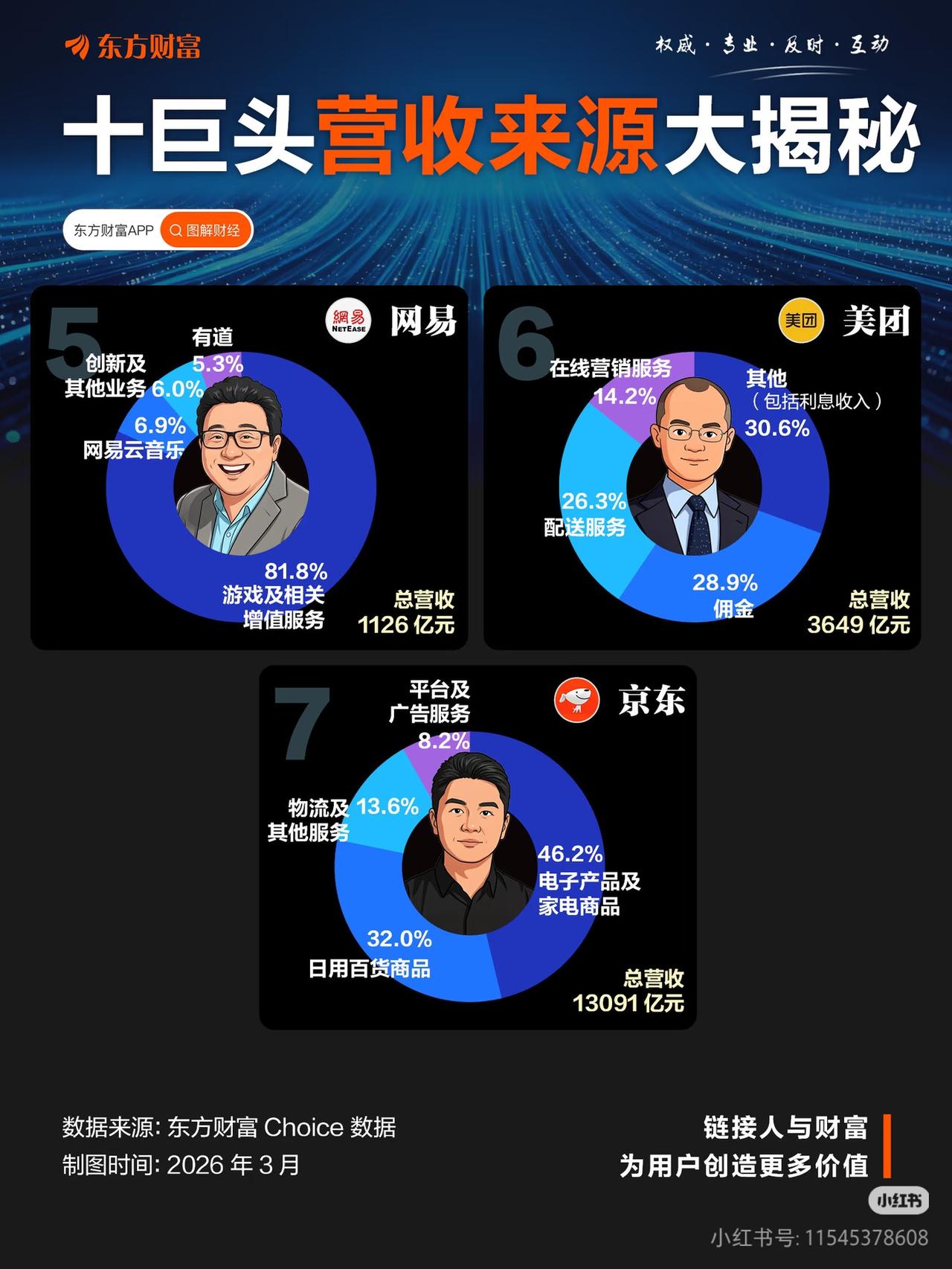 7张图扒透中国互联网巨头的赚钱逻辑!谁的护城河最硬? 很多人买互联网股票,只看名气不看生意,结果踩坑无数。这组东方财富的营收拆解图,直接把7大巨头的赚钱密码扒得明明白白! 1️⃣ 腾讯(总营收7518亿):社交帝国的流量变现 - 核心盘:增值服务(游戏/社交)49.1%,微信+QQ的社交护城河,游戏是现金奶牛 - 增长极:金融科技及企业服务30.5%,微信支付+ToB业务持续发力 - 观点:腾讯的护城河从来不是游戏,而是微信构建的国民社交网络,所有业务都是流量的二次变现,稳如泰山。 2️⃣ 阿里(总营收10167亿):电商生态的绝对龙头 - 核心盘:电商业务46.3%,淘宝/天猫是国内电商基本盘 - 增长极:云智能集团14.4%,阿里云是国内云服务第一,技术护城河深厚 - 观点:阿里本质是电商基础设施公司,从B2B到B2C、从国内到国际的完整生态,是它无法被撼动的根基。 3️⃣ 京东(总营收13091亿):重资产模式的胜利 - 核心盘:电子产品及家电46.2%,3C自营正品心智深入人心 - 护城河:物流及其他服务13.6%,京东物流构建的“次日达”履约能力,是轻资产模式永远复制不了的竞争力 - 观点:京东用重资产换来了用户极致信任,完美印证了“好的商业模式,是让自己配得上成功”。 4️⃣ 拼多多(总营收4318亿):下沉市场的逆袭 - 双轮驱动:在线营销服务50.4%+交易服务49.6%,广告+佣金双丰收 - 观点:拼多多用“农村包围城市”撕开电商格局,用低价让用户得利、用流量让商家赚钱,三方共赢的闭环,是它的核心竞争力。 5️⃣ 小米(总营收4573亿):生态链的铁人三项 - 核心盘:智能手机40.8%,流量入口基本盘 - 增长极:智能电动汽车及AI等23.2%,造车+AI打开未来空间 - 观点:小米用“硬件+互联网服务+新零售”的铁人三项,构建了从手机到AIoT的完整生态,雷军的生态链布局,让小米穿越周期。 6️⃣ 美团(总营收3649亿):本地生活的超级网络 - 核心盘:佣金28.9%+配送服务26.3%,外卖+即时配送是基本盘 - 护城河:数百万骑手构建的“万物到家”履约网络,是美团通吃本地生活的根本 - 观点:美团的本质是即时配送运营商,用数字化改造供给端,这是它的核心壁垒。 7️⃣ 网易(总营收1126亿):游戏赛道的隐形冠军 - 绝对基本盘:游戏及相关增值服务81.8%,自研游戏长盛不衰 - 观点:网易是互联网里最专注的公司,丁磊20年坚守游戏赛道,用《梦幻西游》等IP穿越周期,守正出奇,稳如老狗。 💡 核心启示: 投资互联网公司,本质是投商业模式和护城河。 - 腾讯的社交、京东的物流、美团的配送,才是真正的护城河; - 所有伟大的公司,都有一个绝对稳定的基本盘,这是穿越周期的底气; - 差异化是突围关键,拼多多、小米、美团,都是用差异化在巨头缝隙中杀出重围。 互联网巨头 营收拆解 商业模式 投资 护城河 腾讯 阿里 京东 拼多多 美团 小米