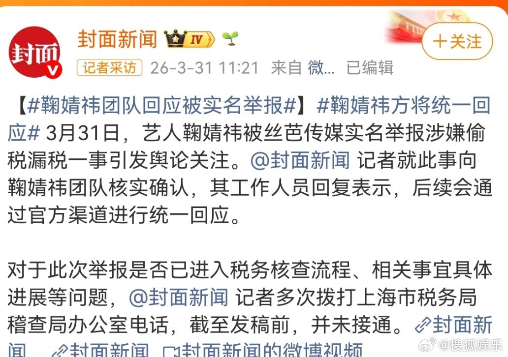 鞠婧祎方将统一回应 据封面新闻报道,3月31日,鞠婧祎被实名举报涉嫌偷税漏税一事引发舆论关注。对此,鞠婧祎工作人员回复表示,后续会通过官方渠道进行统一回应。