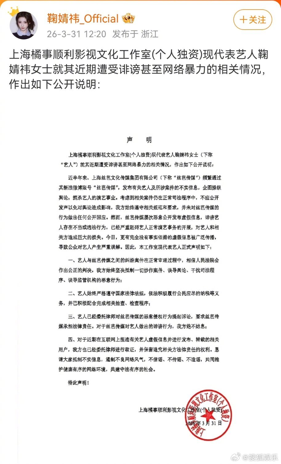 鞠婧祎工作室声明 鞠婧祎方否认偷税漏税鞠婧祎工作室发布声明:
