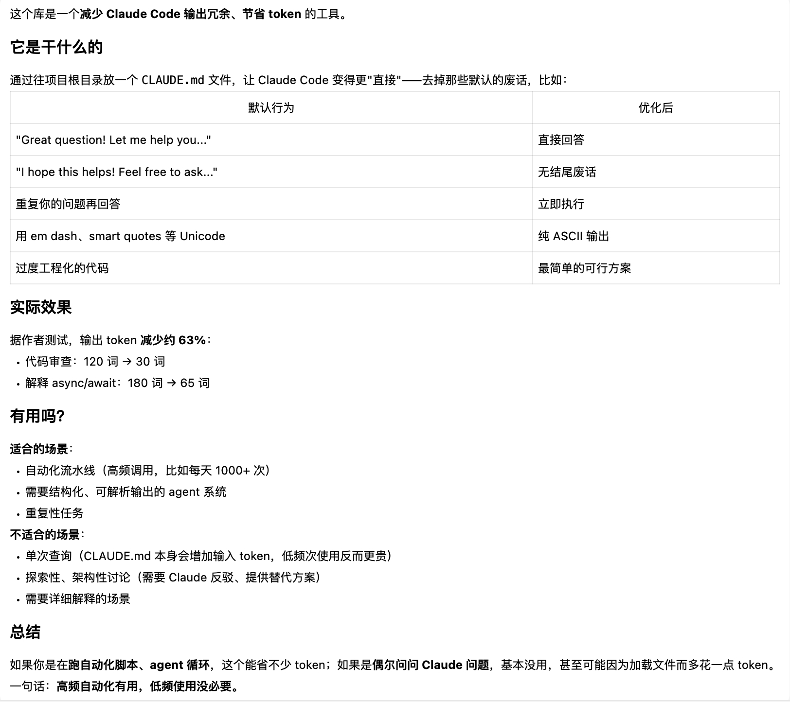不适合的场景:- 单次查询(CLAUDE.md 本身会增加输入 token,低频次使用反而更贵)- 探索性、架构性讨论(需要 Claude 反驳、提供替代方案)- 需要详细解释的场景