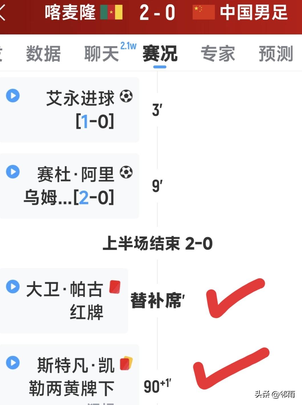 亚洲“熊猫”邂逅非洲“雄狮”,初次碰面时,“熊猫”尚显温文尔雅,“雄狮”却已张牙舞爪。开场仅十分钟,“雄狮”就连进两球,打得“熊猫”措手不及。在随后的八十分钟里,“熊猫”虽勉强稳住阵脚、稍有起色,无奈整体实力差距显著,最终仍以0比2惜败于八次晋级世界杯决赛圈的非洲“雄狮”喀麦隆队。 整场较量中,亚洲“熊猫”拼尽全力,试图以沉稳周旋寻觅反击之机,可面对体格强悍、冲击力十足的非洲“雄狮”,始终难以撕开对方防线。 从整场数据来看,尽显何为老道、何为稚嫩。喀麦隆队凭借老道的经验与高效的进攻,牢牢掌控比赛节奏。即便“熊猫”在后半程奋力反扑,也始终未能攻破对手大门。最终全场比赛结束,温顺却坚韧的“熊猫”,还是以0:2负于这支八次跻身世界杯决赛圈、声名显赫的非洲“雄狮”。 不过,这场比赛也让“雄狮”队主教练和球员付出了两张红牌的代价,同时也让中国“熊猫”看清了自己与世界足球的差距。