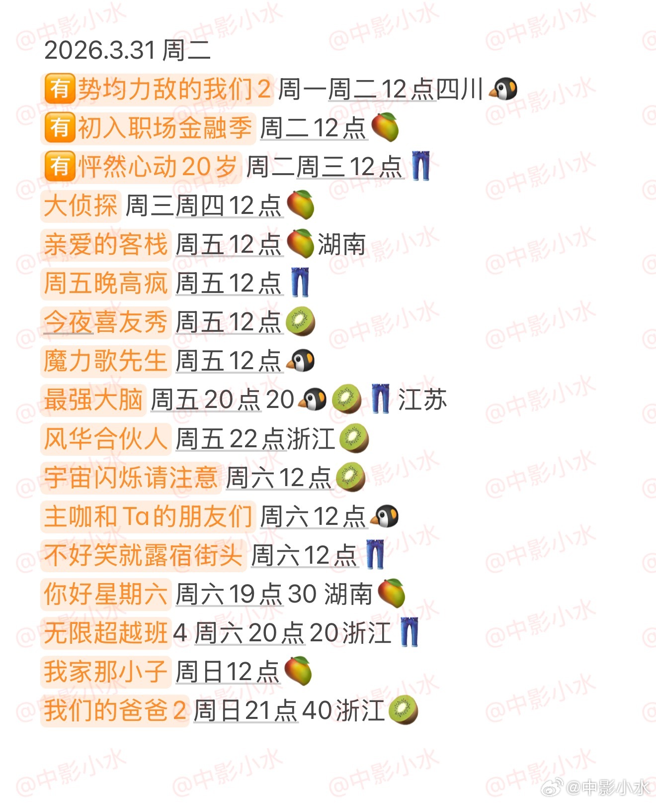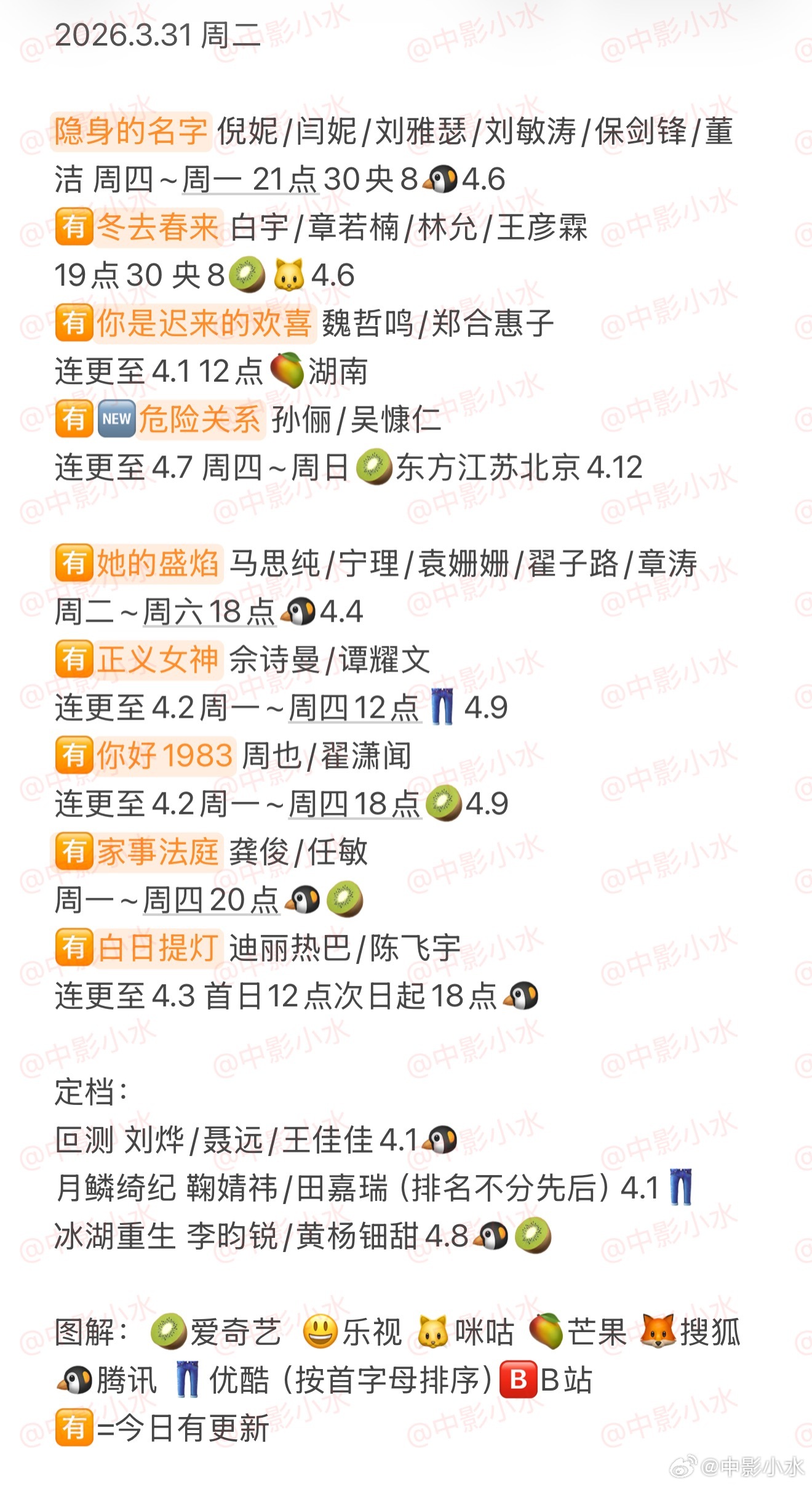 🈶她的盛焰 马思纯/宁理/袁姗姗/翟子路/章涛🈶正义女神 佘诗曼/谭耀文🈶你好1983 周也/翟潇闻 🈶家事法庭 龚俊/任敏🈶白日提灯 迪丽热巴/陈飞宇