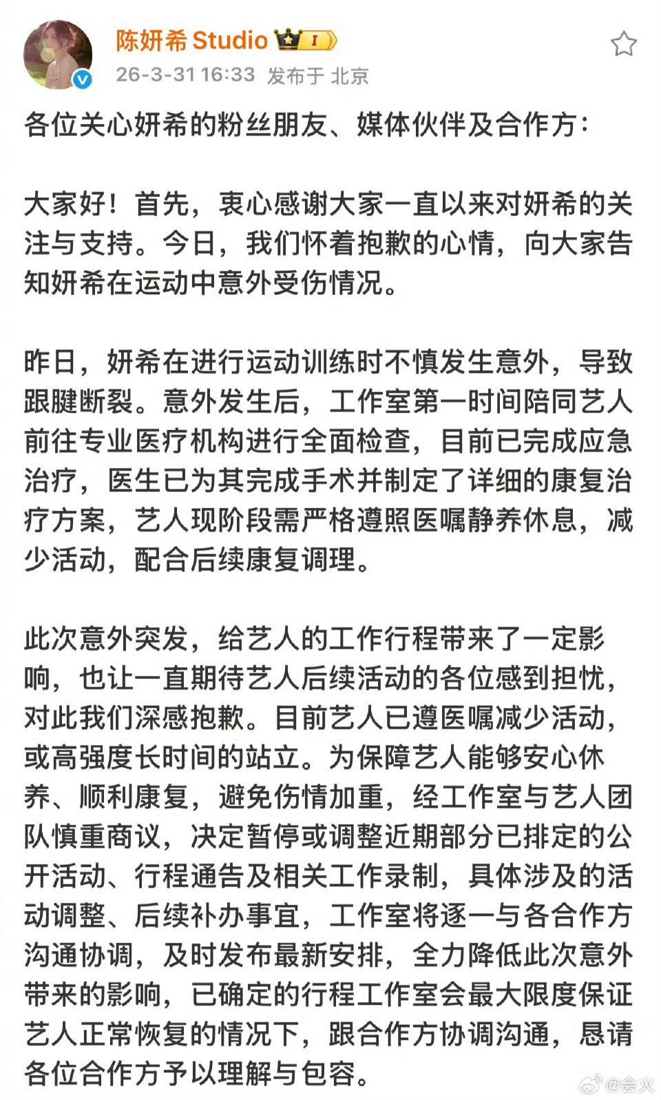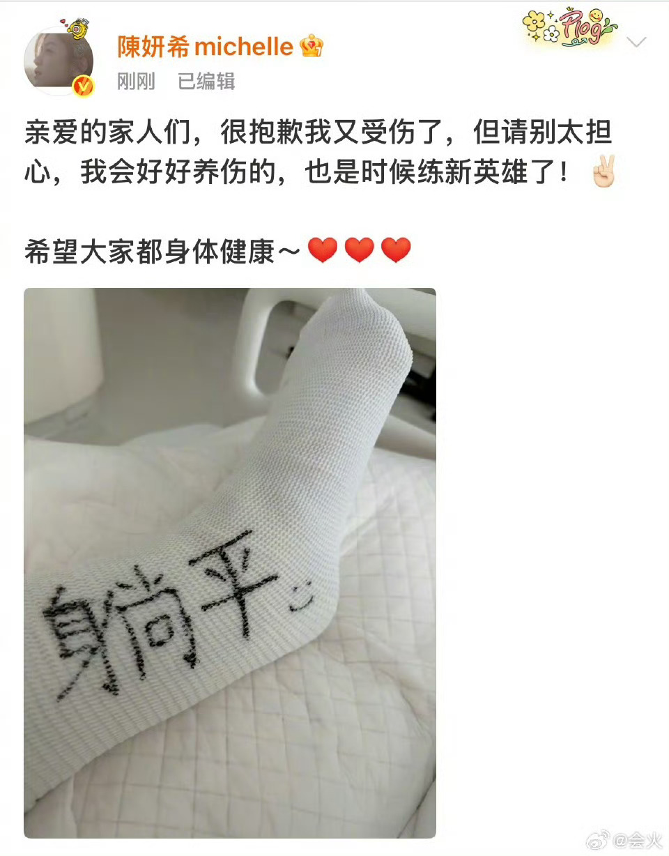 陈妍希跟腱断裂受伤陈妍希发博报平安